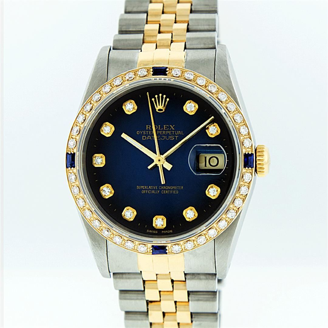 One Mens Two Tone Rolex Datejust Polished, Serviced & Electronically Tested, 14K Yellow Gold & Stainless Steel Case:36mm, 14K Yellow Gold Crown, Custom Bezel: 18K Yellow Gold Sapphire Beadset Diamond Bezel, Diamond Count: 36 Diamonds + 4 Sapphires Total Weight 1.00 Carat, Clarity: Si-VS, Color: G to H. Custom Crystal: Synthetic Sapphire Cyclops Lens. Movement: Automatic Winding Movement Caliber 3035. Custom Dial: Blue Vignette With Diamond Hour Markers. Diamond Count: 10 Diamonds Clarity: SI-VS, Color: Color G to H Date Window: 3 O'Clock Position Date Display, Quickset, Model: 16013 Condition: G-6 Extra Fine. Bracelet:Two Tone 14K Yellow Gold & Stainless Steel Jubilee. Bright Polish. 6.5 Inch Length, Adjustable. Standard Clasp, With Rolex Logo.