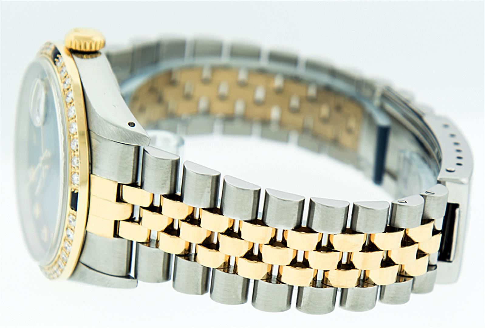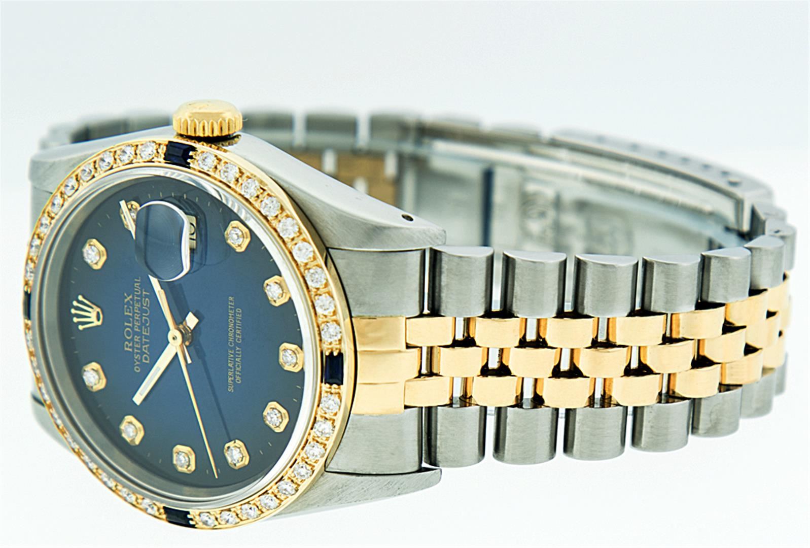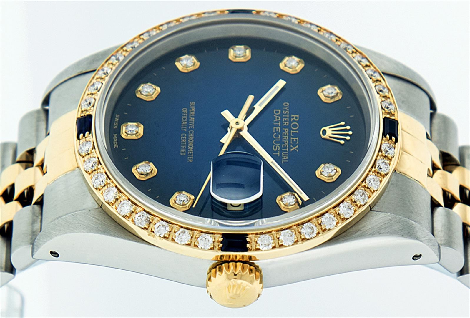 One Mens Two Tone Rolex Datejust Polished, Serviced & Electronically Tested, 14K Yellow Gold & Stainless Steel Case:36mm, 14K Yellow Gold Crown, Custom Bezel: 18K Yellow Gold Sapphire Beadset Diamond Bezel, Diamond Count: 36 Diamonds + 4 Sapphires Total Weight 1.00 Carat, Clarity: Si-VS, Color: G to H. Custom Crystal: Synthetic Sapphire Cyclops Lens. Movement: Automatic Winding Movement Caliber 3035. Custom Dial: Blue Vignette With Diamond Hour Markers. Diamond Count: 10 Diamonds Clarity: SI-VS, Color: Color G to H Date Window: 3 O'Clock Position Date Display, Quickset, Model: 16013 Condition: G-6 Extra Fine. Bracelet:Two Tone 14K Yellow Gold & Stainless Steel Jubilee. Bright Polish. 6.5 Inch Length, Adjustable. Standard Clasp, With Rolex Logo.