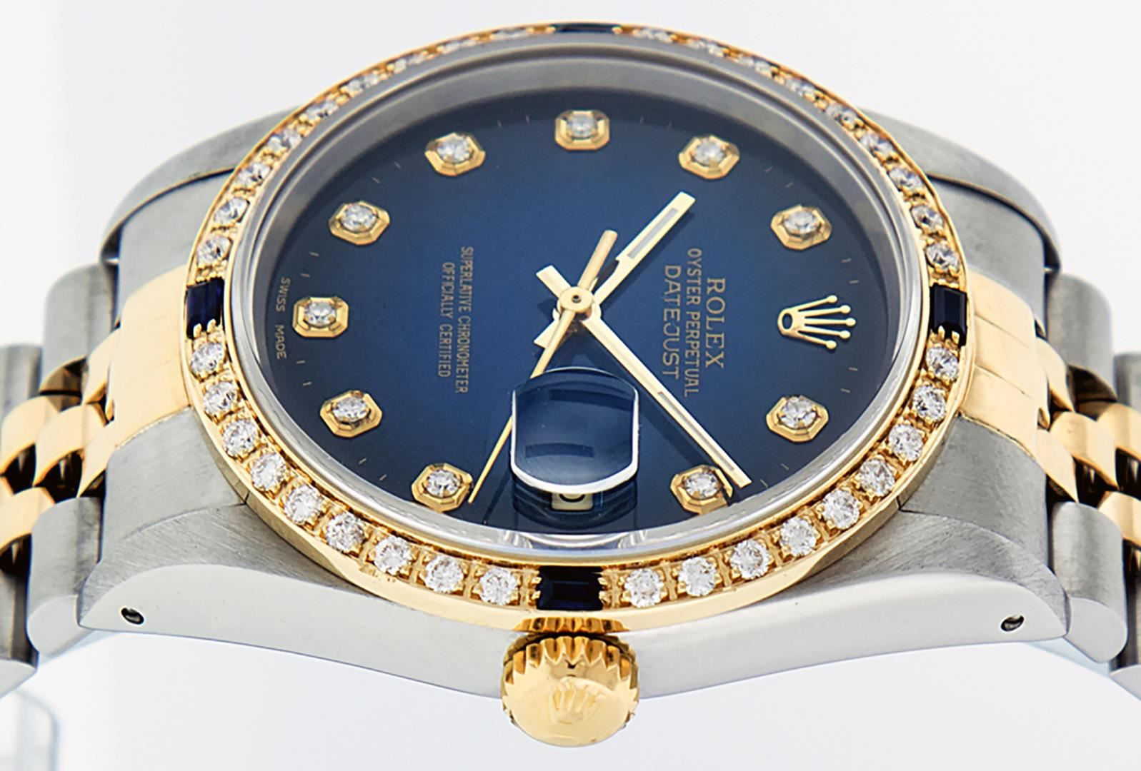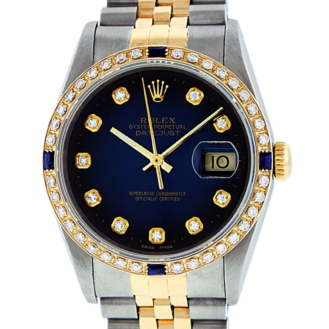 One Mens Pre Owned Rolex Yellow Gold And Steel Two Tone Rolex Datejust Polished, Serviced & Electronically Tested, Rolex Case: Yellow Gold And Stainless Steel Case: 36mm, Rolex Yellow Gold Crown, Custom Bezel: New 18K Yellow Gold Sapphire Beadset Diamond Bezel, Diamond Count: 36 Diamonds + 4 Sapphires. Custom Crystal: New Sapphire With Magnified Date Window. Custom Hands: New Luminescent Hands. Rolex Movement: Automatic Winding Movement. Custom Dial: Refinished To Blue Vignette With Custom Added Diamond Hour Markers & Dash Track. Diamond Count: 10 Diamonds, Clarity: VS, Color: G to H Date Window: 3 O'Clock Position Date Display, Quickset, Model: Datejust, Condition: G-6 Extra Fine. Rolex Bracelet: Two Tone Yellow Gold & Stainless Steel Jubilee. Bright Polish. 7.0 Inch Length, Adjustable. Standard Clasp, With Rolex Logo. This Watch Has Been Serviced Time Tested And Is In Excellent Condition It Is Free Of All Scratches And Dents.
