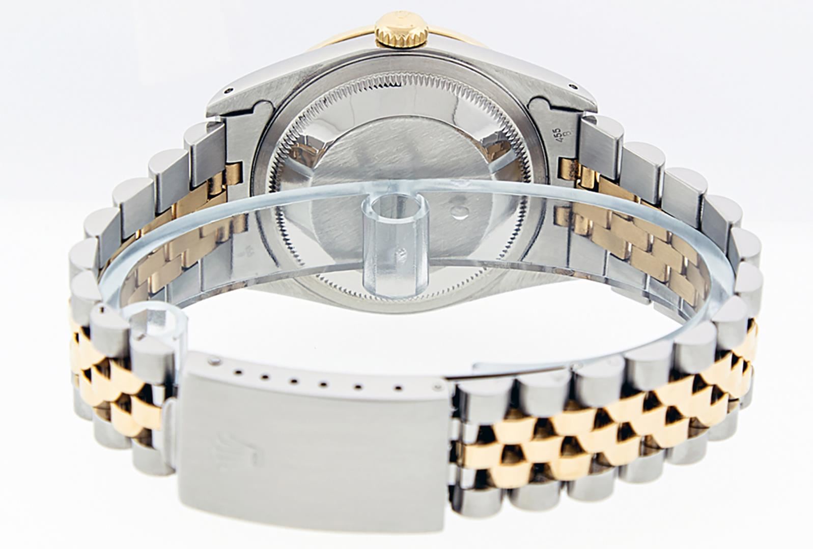 One Mens Pre Owned Rolex Yellow Gold And Steel Two Tone Rolex Datejust Polished, Serviced & Electronically Tested, Rolex Case: Yellow Gold And Stainless Steel Case: 36mm, Rolex Yellow Gold Crown, Custom Bezel: New 18K Yellow Gold Sapphire Beadset Diamond Bezel, Diamond Count: 36 Diamonds + 4 Sapphires. Custom Crystal: New Sapphire With Magnified Date Window. Custom Hands: New Luminescent Hands. Rolex Movement: Automatic Winding Movement. Custom Dial: Refinished To Blue Vignette With Custom Added Diamond Hour Markers & Dash Track. Diamond Count: 10 Diamonds, Clarity: VS, Color: G to H Date Window: 3 O'Clock Position Date Display, Quickset, Model: Datejust, Condition: G-6 Extra Fine. Rolex Bracelet: Two Tone Yellow Gold & Stainless Steel Jubilee. Bright Polish. 7.0 Inch Length, Adjustable. Standard Clasp, With Rolex Logo. This Watch Has Been Serviced Time Tested And Is In Excellent Condition It Is Free Of All Scratches And Dents.