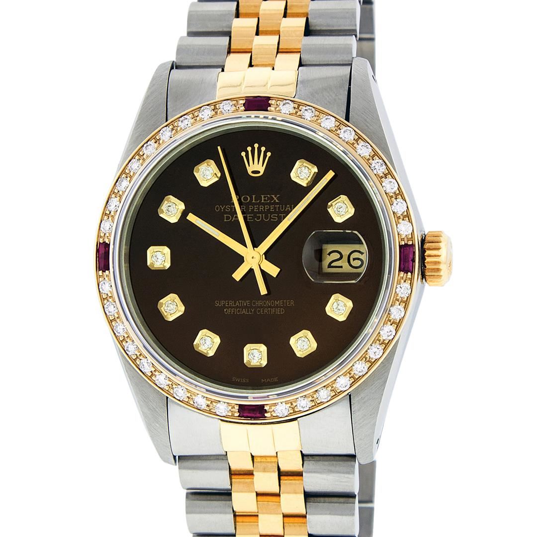 One Mens Pre Owned Rolex Two Tone Yellow Gold And Stainless Steel Datejust Polished, Serviced & Electronically Tested, Rolex Yellow Gold & Stainless Steel Case: 36mm, Rolex Yellow Gold Crown, Custom Bezel: New 18K Yellow Gold Ruby Beadset Diamond Bezel, Diamond Count: 36 Diamonds + 4 Rubies. Custom Crystal: New Sapphire With Date Window. Custom Hands: New Luminescent Hands. Rolex Movement: Automatic Winding Movement 3035. Custom Dial: Custom Brown Dial With Added Diamonds. Diamond Count: 10 Diamonds On Dial. Date Window: 3 O'Clock Position Date Display, Quickset, Model: Datejust. Condition: G-6 Extra Fine. Rolex Bracelet: Two Tone Yellow Gold And Stainless Steel Jubilee Band. Bright Polish. 7.0 Inch Length, Adjustable. Standard Clasp, With Rolex Logo. This Watch Has Been Serviced Time Tested And Is In Excellent Condition It Is Free Of All Scratches And Dents.