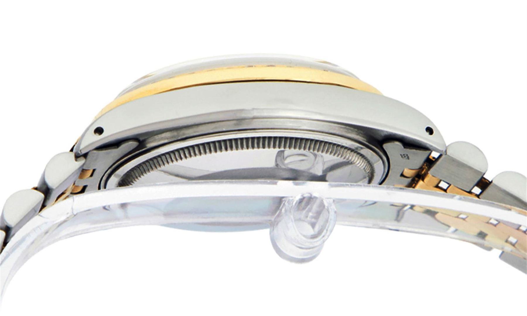 One Mens Rolex Two Tone Rolex Datejust Polished, Serviced & Electronically Tested, 18K Yellow Gold & Stainless Steel Case:36mm, 18K Yellow Gold Crown, Custom Bezel: 18K Yellow Gold Beadset Diamond Bezel, Diamond Count: 44 Diamonds, Total Weight 1.00 Carat, Clarity: SI-VS, Color: G to H. Crystal: Synthetic Sapphire Cyclops Lens. Movement: Automatic Winding Movement Caliber 3135. Custom Dial: Champagne and Baguette Hour Markers On 6 and 9, Diamond Count: 8 + 2 Baguette Diamonds in Dial G To H In Color , Date Window: 3 O'Clock Position Date Display, Quickset, Model: 16013 Condition: G-6 Extra Fine. Bracelet: Two Tone 18K Yellow Gold & Stainless Steel Jubilee. Bright Polish. 7.0 Inch Length, Adjustable. Standard Clasp, With Rolex Logo. This watch has been serviced and polished and its free of all dents and scratches and has been time tested.