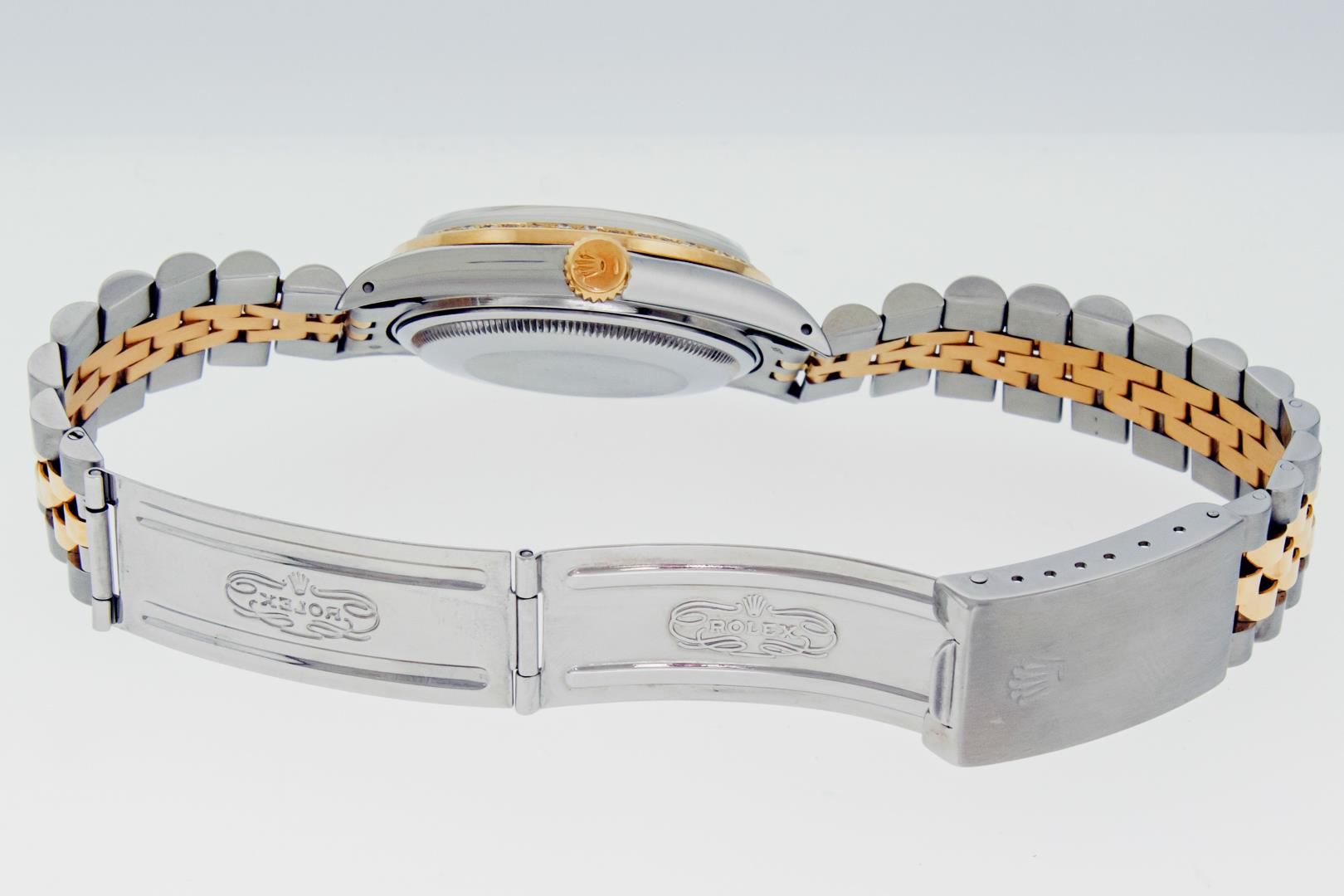 One Mens Pre Owned Two Tone Yellow Gold & Stainless Steel Rolex Datejust Polished, Serviced & Electronically Tested, Yellow Gold & Stainless Steel Case: 36mm, Rolex Yellow Gold Crown, Custom Bezel: New 18K Yellow Gold Beadset Diamond Bezel, Diamond Count: 44 Diamonds, Clarity: SI-VS, Color: G to H. Custom Crystal: New Sapphire With Magnified Date Window. Custom Hands: New Hands. Rolex Movement: Automatic Winding Movement. Rolex Factory Dial: Champagne Dial With Diamond Hour Markers. Diamond Count: 10 Diamonds In Dial. Date Window: 3 O'Clock Position Date Display, Quickset, Model: Datejust. Condition: G-6 Extra Fine. Rolex Bracelet: Two Tone Yellow Gold & Stainless Steel Jubilee Band. Bright Polish. 7.0 Inch Length, Adjustable. Standard Clasp, With Rolex Logo. This Watch Has Been Serviced Time Tested And Is In Excellent Condition It Is Free Of All Scratches And Dents.