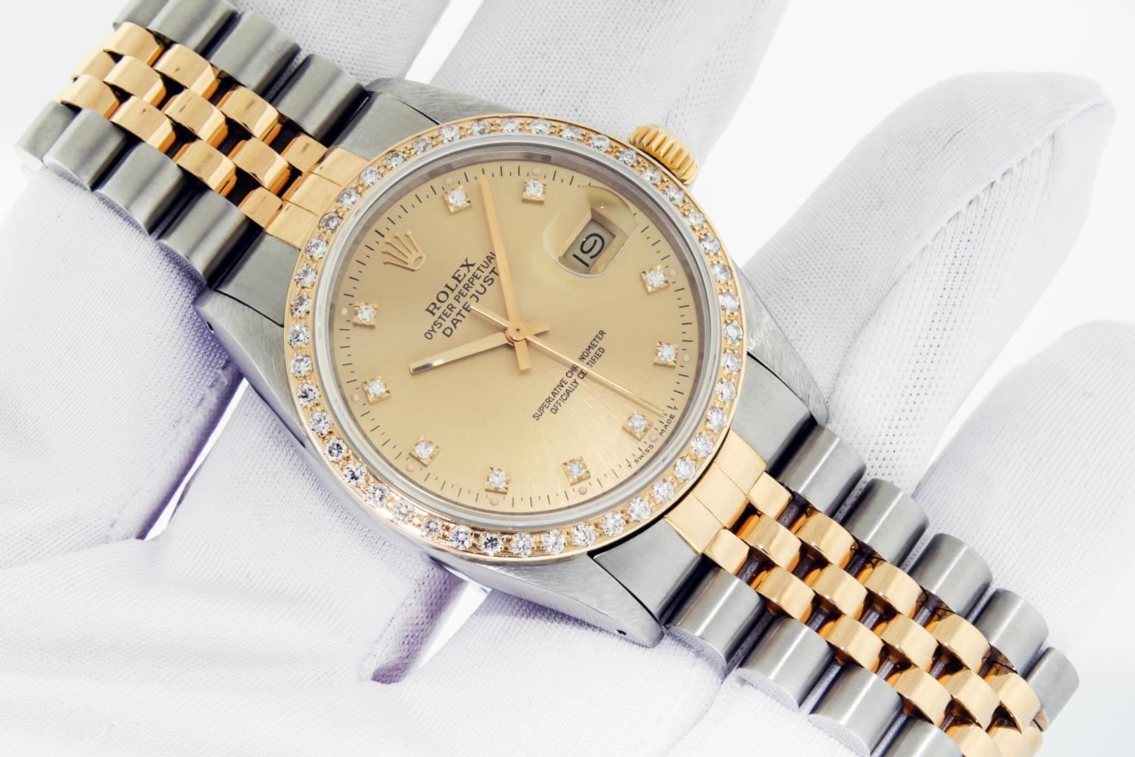 One Mens Pre Owned Two Tone Yellow Gold & Stainless Steel Rolex Datejust Polished, Serviced & Electronically Tested, Yellow Gold & Stainless Steel Case: 36mm, Rolex Yellow Gold Crown, Custom Bezel: New 18K Yellow Gold Beadset Diamond Bezel, Diamond Count: 44 Diamonds, Clarity: SI-VS, Color: G to H. Custom Crystal: New Sapphire With Magnified Date Window. Custom Hands: New Hands. Rolex Movement: Automatic Winding Movement. Rolex Factory Dial: Champagne Dial With Diamond Hour Markers. Diamond Count: 10 Diamonds In Dial. Date Window: 3 O'Clock Position Date Display, Quickset, Model: Datejust. Condition: G-6 Extra Fine. Rolex Bracelet: Two Tone Yellow Gold & Stainless Steel Jubilee Band. Bright Polish. 7.0 Inch Length, Adjustable. Standard Clasp, With Rolex Logo. This Watch Has Been Serviced Time Tested And Is In Excellent Condition It Is Free Of All Scratches And Dents.