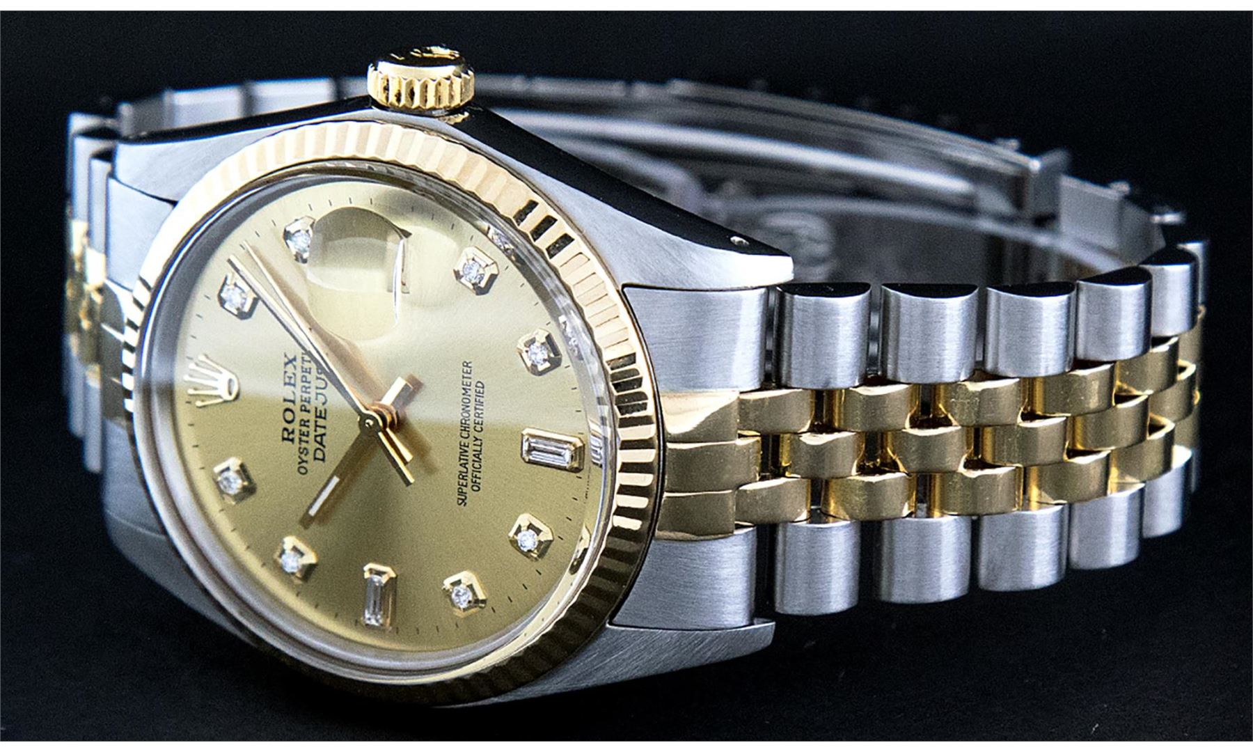 One Mens Pre Owned Rolex Yellow Gold And Stainless Steel Two Tone Rolex Datejust Polished, Serviced & Electronically Tested, Rolex Yellow Gold And Stainless Steel Case: 36mm, Rolex Yellow Gold Crown, Rolex Bezel: Yellow Gold Fluted Bezel. Custom Crystal: New Acrylic With Magnified Date Window. Custom Hands: New Luminescent Hands. Rolex Movement: Automatic Winding Movement 3035. Custom Dial: Custom Champagne Dial With Added Diamonds, Diamond Count: 8 Diamonds + 2 Baguette Diamonds in Dial. Date Window: 3 O'clock Position Date Display, Quickset, Model: Quickset Datejust, Condition: G-6 Extra Fine. Rolex Bracelet: Two Tone Yellow Gold And Stainless Steel Jubilee Band. Bright Polish. 7.0 Inch Length, Adjustable. Standard Clasp, With Rolex Logo. This Watch Has Been Serviced And Polished It Is Free Of All Scratches And Dents.