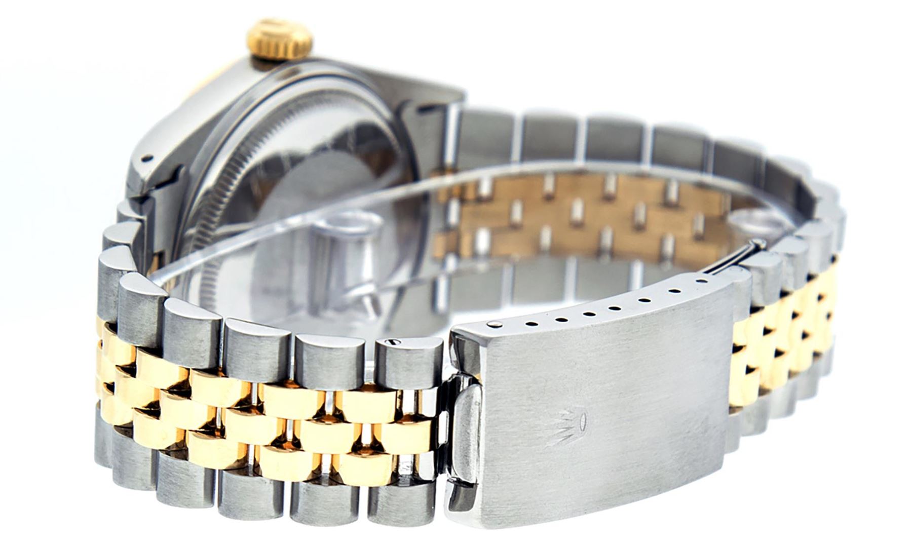 One Mens Pre Owned Rolex Yellow Gold And Stainless Steel Two Tone Rolex Datejust Polished, Serviced & Electronically Tested, Rolex Yellow Gold & Stainless Steel Case: 36mm, Rolex Yellow Gold Crown, Rolex Bezel: Yellow Gold Fluted Bezel. Custom Crystal: New Acrylic With Magnified Date Window. Custom Hands: New Luminescent Hands. Rolex Movement: Automatic Winding Movement 3035. Custom Dial: Custom Champagne Dial With Added Diamonds, Diamond Count: 8 Diamonds + 2 Baguette Diamonds in Dial. Date Window: 3 O'Clock Position Date Display, Quickset, Model: Datejust, Condition: G-6 Extra Fine. Rolex Bracelet: Two Tone Yellow Gold & Stainless Steel Jubilee Band. Bright Polish. 7.0 Inch Length, Adjustable. Standard Clasp, With Rolex Logo. This Watch Has Been Serviced And Polished It Is Free Of All Scratches And Dents.