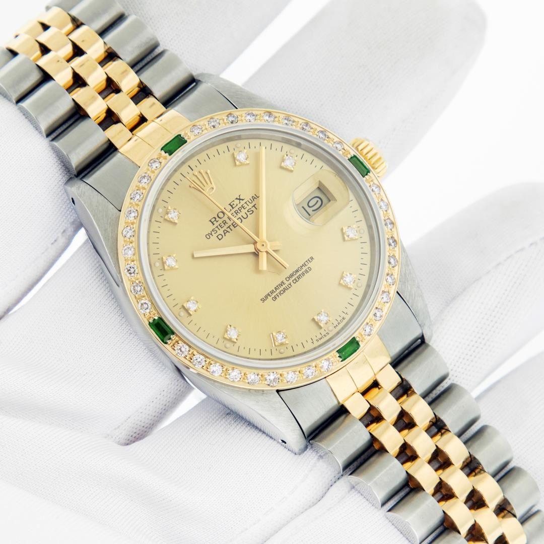 One Mens Pre owned Two Tone Yellow Gold & Stainless Steel Rolex Datejust Polished, Serviced & Electronically Tested, Yellow Gold & Stainless Steel Case: 36mm, Rolex Yellow Gold Crown, Custom Bezel: New 18K Yellow Gold Emerald Beadset Diamond Bezel, Diamond Count: 36 Diamonds + 4 Emeralds, Clarity: SI-VS, Color: G to H. Custom Crystal: New Sapphire With Magnified Date Window. Custom Hands: New Hands. Rolex Movement: Automatic Winding Movement. Rolex Factory Dial: Champagne Dial With Diamond Hour Markers. Diamond Count: 10 Diamonds In Dial. Date Window: 3 O'Clock Position Date Display, Quickset, Model: Datejust. Condition: G-6 Extra Fine. Rolex Bracelet: Two Tone Yellow Gold & Stainless Steel Jubilee Band. Bright Polish. 7.0 Inch Length, Adjustable. Standard Clasp, With Rolex Logo. This Pre Owned Watch Has Been Serviced Time Tested And Is In Excellent Condition It Is Free Of All Scratches And Dents.
