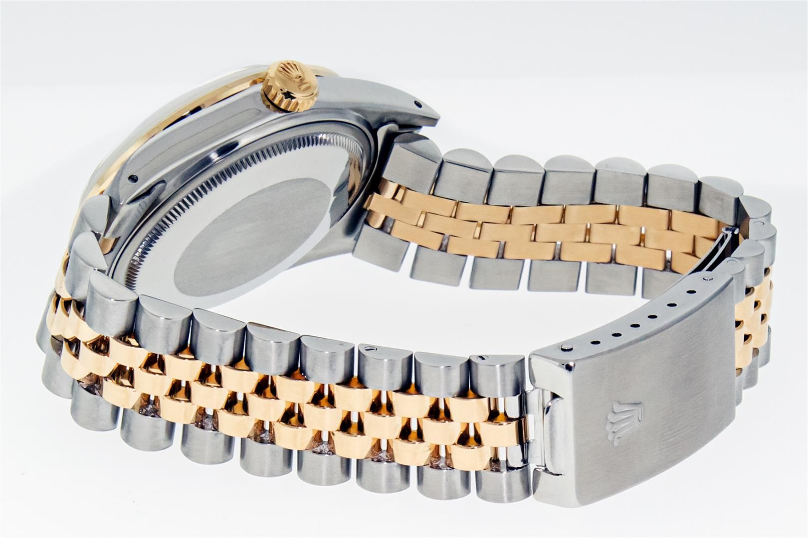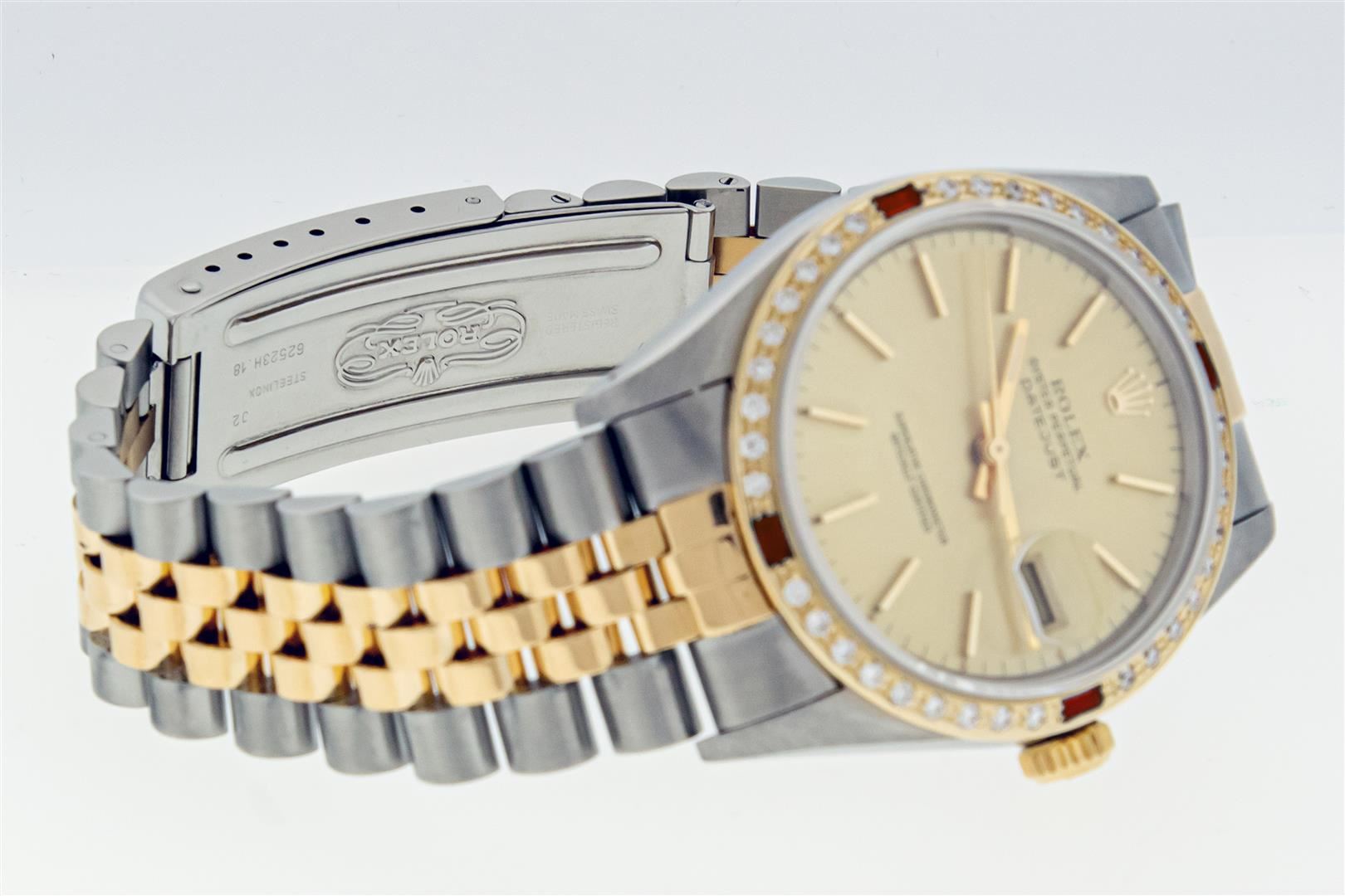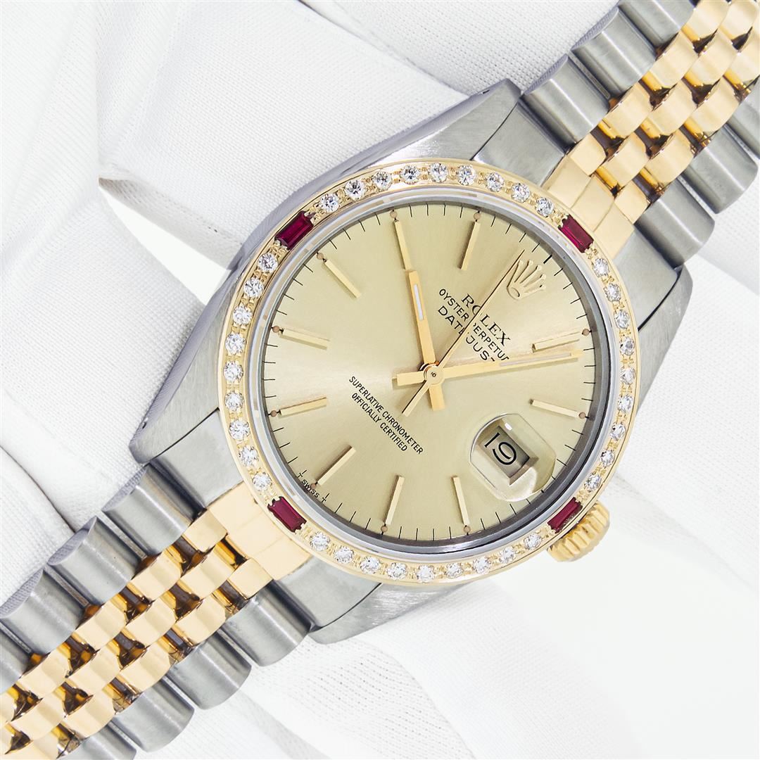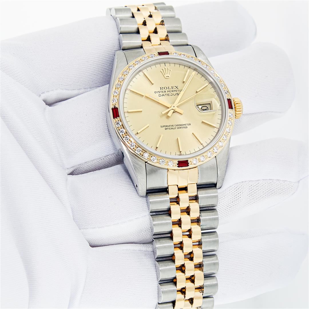 One Mens Pre Owned Two Tone Yellow Gold & Stainless Steel Rolex Datejust Polished, Serviced & Electronically Tested, Yellow Gold & Stainless Steel Case: 36mm, Rolex Yellow Gold Crown, Custom Bezel: New 18K Yellow Gold Ruby Beadset Diamond Bezel, Diamond Count: 36 Diamonds + 4 Rubies, Clarity: SI-VS, Color: G to H. Custom Crystal: New Sapphire With Magnified Date Window. Custom Hands: New Hands. Rolex Movement: Automatic Winding Movement. Rolex Factory Dial: Champagne With Index Hour Markers And Dash Track. Date Window: 3 O'Clock Position Date Display, Quickset, Model: Datejust. Condition: G-6 Extra Fine. Rolex Bracelet: Two Tone Yellow Gold & Stainless Steel Jubilee Band. Bright Polish. 7.0 Inch Length, Adjustable. Standard Clasp, With Rolex Logo. This Watch Has Been Serviced Time Tested And Is In Excellent Condition It Is Free Of All Scratches And Dents.