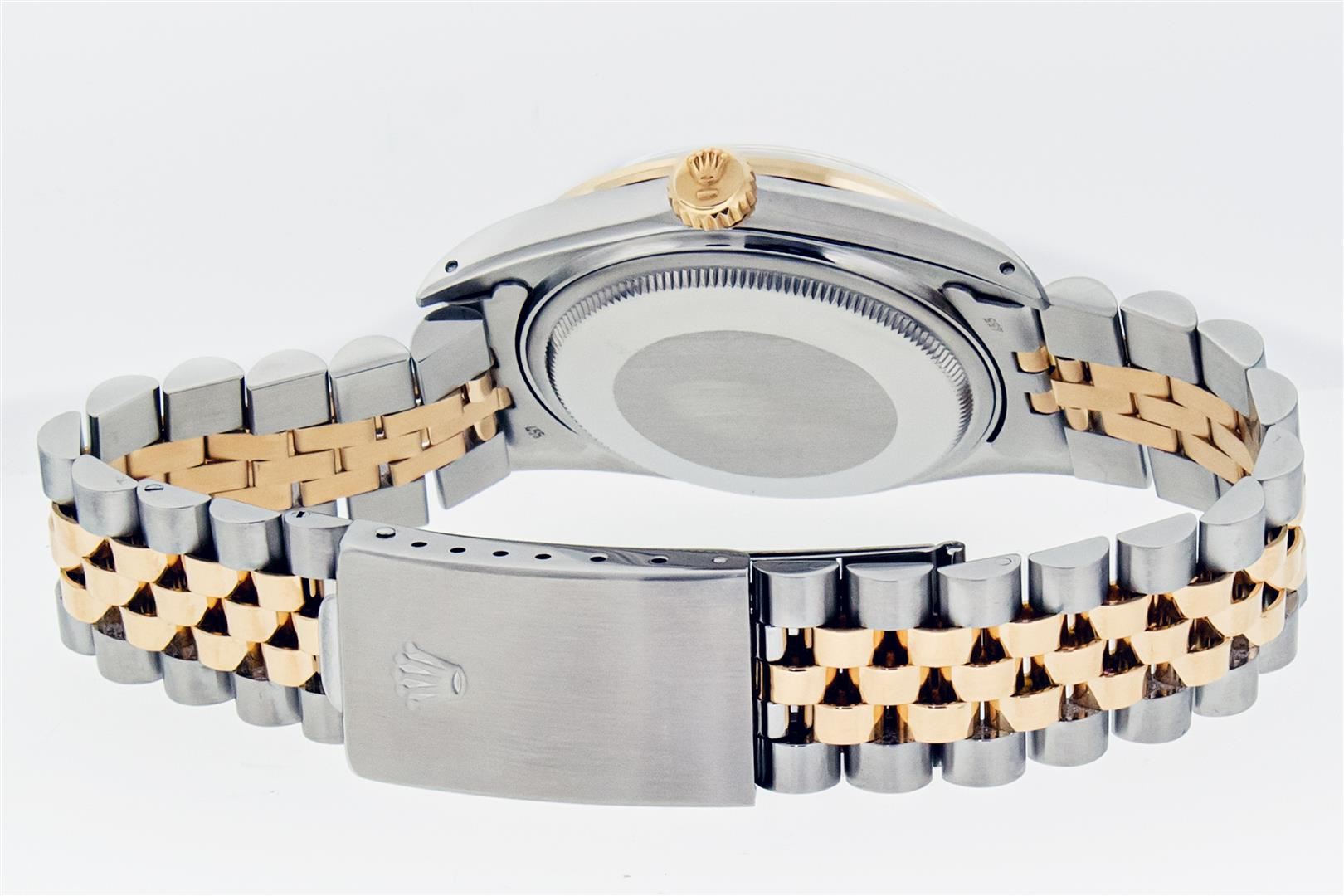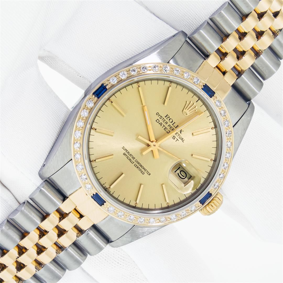 One Mens Pre Owned Two Tone Yellow Gold & Stainless Steel Rolex Datejust Polished, Serviced & Electronically Tested, Yellow Gold & Stainless Steel Case: 36mm, Rolex Yellow Gold Crown, Custom Bezel: New 18K Yellow Gold Sapphire Beadset Diamond Bezel, Diamond Count: 36 Diamonds + 4 Sapphires, Clarity: SI-VS, Color: G to H. Custom Crystal: New Sapphire With Magnified Date Window. Custom Hands: New Hands. Rolex Movement: Automatic Winding Movement. Rolex Factory Dial: Champagne With Index Hour Markers And Dash Track. Date Window: 3 O'Clock Position Date Display, Quickset, Model: Datejust. Condition: G-6 Extra Fine. Rolex Bracelet: Two Tone Yellow Gold & Stainless Steel Jubilee Band. Bright Polish. 7.0 Inch Length, Adjustable. Standard Clasp, With Rolex Logo. This Watch Has Been Serviced Time Tested And Is In Excellent Condition It Is Free Of All Scratches And Dents.