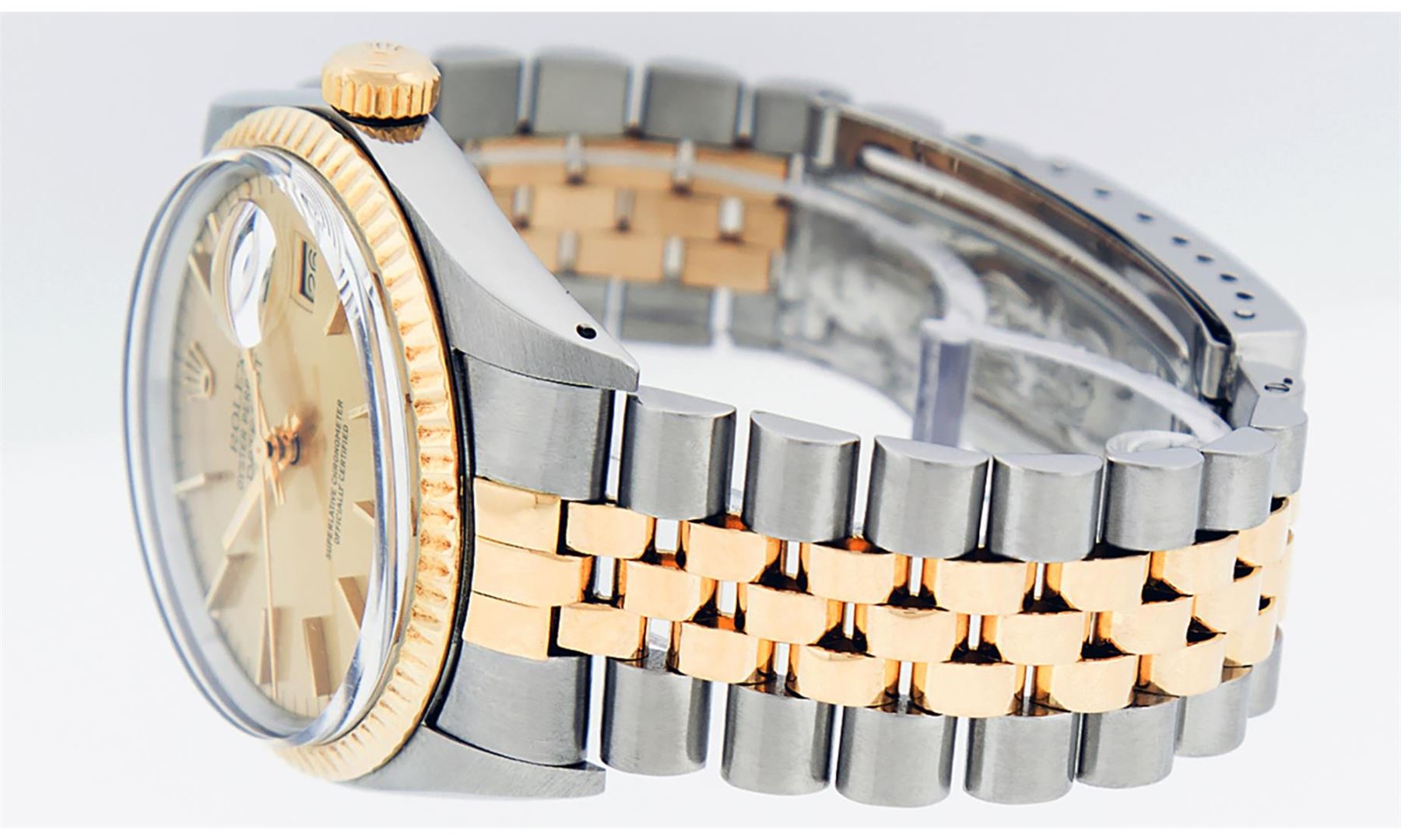 One Rolex Mens Pre Owned Yellow Gold And Stainless Steel Rolex Datejust Polished, Serviced & Electronically Tested, Yellow Gold & Stainless Steel Case: 36mm,14K Yellow Gold Crown, Bezel: 14K Yellow Gold Fluted Bezel. Custom Crystal: New Acrylic Cyclops Lens. Hands: Luminescent Hands. Rolex Movement: Automatic Winding Movement 3035. Rolex Dial: Champagne Dial With Index Hour Markers With Dash Track & Lumi Dots. Date Window: 3 O'Clock Position Date Display, Quickset, Model: Quickset Datejust. Condition: G-6 Extra Fine. Rolex Bracelet: 14K Two Tone Yellow Gold & Stainless Steel Jubilee Band. Bright Polish. 7.0 Inch Length, Adjustable. Standard Clasp, With Rolex Logo. This Watch Has Been Serviced Time Tested And Is In Excellent Condition It Is Free Of All Scratches And Dents.