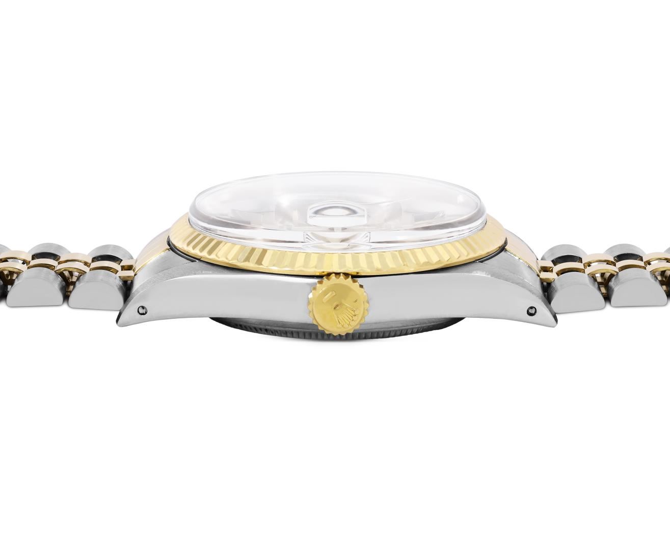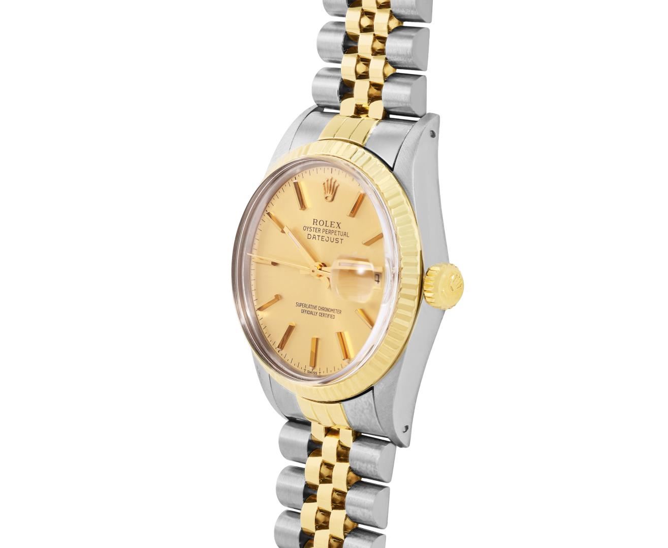 One Mens Pre Owned 18K Two Tone Yellow Gold And Stainless Steel Rolex Datejust Polished, Serviced And Electronically Tested, Rolex Yellow Gold And Stainless Steel Case: 36mm, Rolex Yellow Gold Crown, Rolex Bezel: Yellow Gold Fluted Bezel. Custom Crystal: New Plastic With Magnified Date Window. Hands: Luminescent Hands. Rolex Movement: Automatic Winding Movement 3035. Rolex Dial: Champagne Dial With Index Hour Markers and Dash Track With Lumi Dots. Date Window: 3 O'Clock Position Date Display, Quickset, Model: Quickset Datejust. Condition: G-6 Extra Fine. Rolex Bracelet: Two Tone Yellow Gold And Stainless Steel Jubilee Band. Bright Polish. 7.0 Inch Length, Adjustable. Standard Clasp, With Rolex Logo. This Watch Has Been Serviced Time Tested And Is In Excellent Condition It Is Free Of All Scratches And Dents.