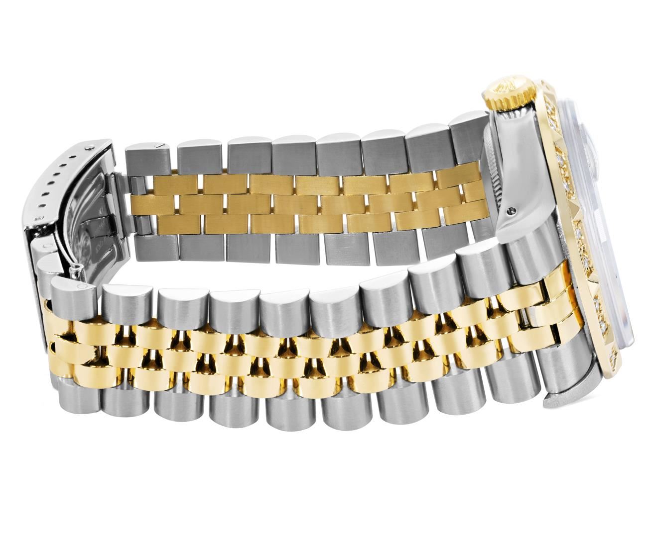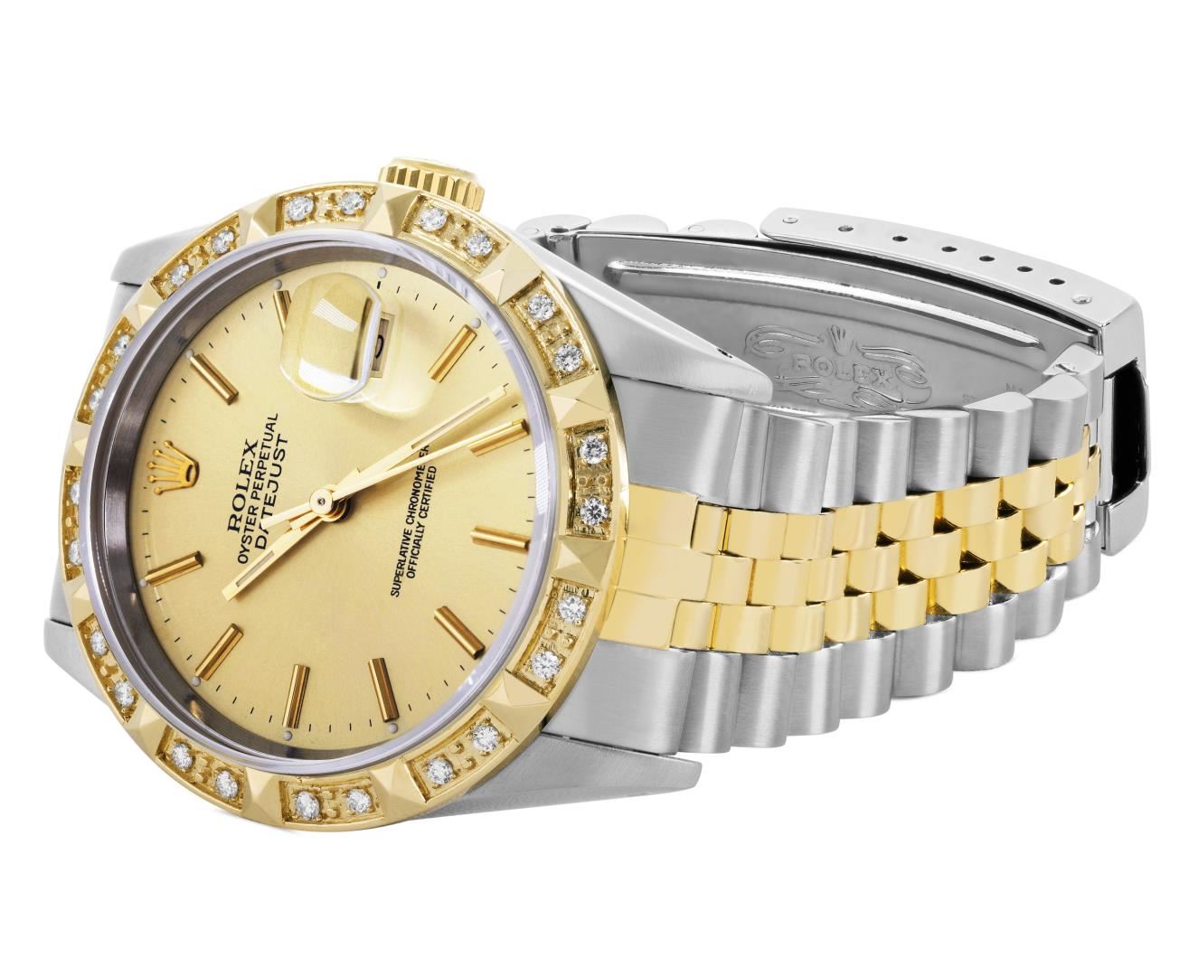 One Mens Pre Owned Yellow Gold Two Tone Rolex Datejust Polished, Serviced And Electronically Tested, Rolex Yellow Gold And Stainless Steel Case: 36mm, Rolex 14K Yellow Gold Crown, Custom Bezel: New 18K Yellow Gold Pyramid Diamond Bezel, Diamond Count: 24 Diamonds. Custom Crystal: New Sapphire With Magnified Date Window. Custom Hands: New Luminecent Hands. Rolex Movement: Automatic Winding Movement. Rolex Dial: Champagne Dial With Index Hour Markers and Small Track With Lumi Dots. Date Window: 3 O'Clock Position Date Display, Quickset, Model: Quickset Datejust. Condition: G-6 Extra Fine. Rolex Bracelet: Two Tone Yellow Gold And Stainless Steel Jubilee Band. Bright Polish. 7.0 Inch Length, Adjustable. Standard Clasp, With Rolex Logo. This Watch Has Been Serviced Time Tested And Is In Excellent Condition It Is Free Of All Scratches And Dents. This Watch Comes With A Rolex Box.