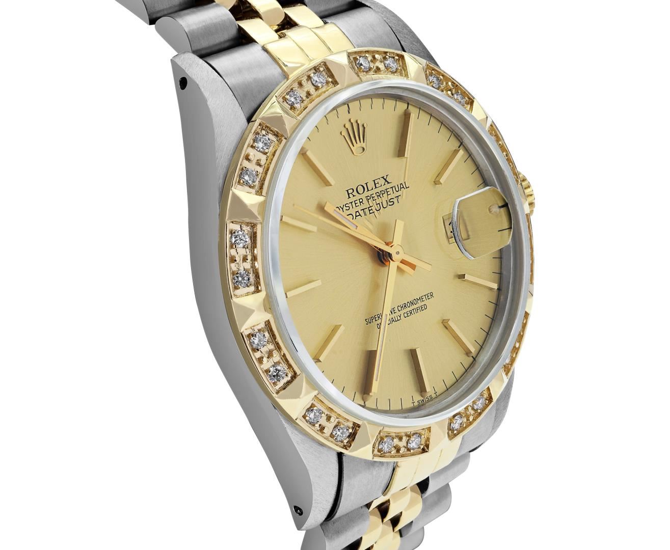One Mens Pre Owned Yellow Gold Two Tone Rolex Datejust Polished, Serviced And Electronically Tested, Rolex Yellow Gold And Stainless Steel Case: 36mm, Rolex Yellow Gold Crown, Custom Bezel: New 18K Yellow Gold Pyramid Diamond Bezel, Diamond Count: 24 Diamonds. Custom Crystal: New Sapphire With Magnified Date Window. Custom Hands: New Luminecent Hands. Rolex Movement: Automatic Winding Movement 3035. Rolex Dial: Champagne Dial With Index Hour Markers and Dash Track With Lumi Dots. Date Window: 3 O'Clock Position Date Display, Quickset, Model: Quickset Datejust. Condition: G-6 Extra Fine. Rolex Bracelet: Two Tone Yellow Gold And Stainless Steel Jubilee Band. Bright Polish. 7.0 Inch Length, Adjustable. Standard Clasp, With Rolex Logo. This Watch Has Been Serviced Time Tested And Is In Excellent Condition It Is Free Of All Scratches And Dents. This Watch Comes With A Rolex Box.