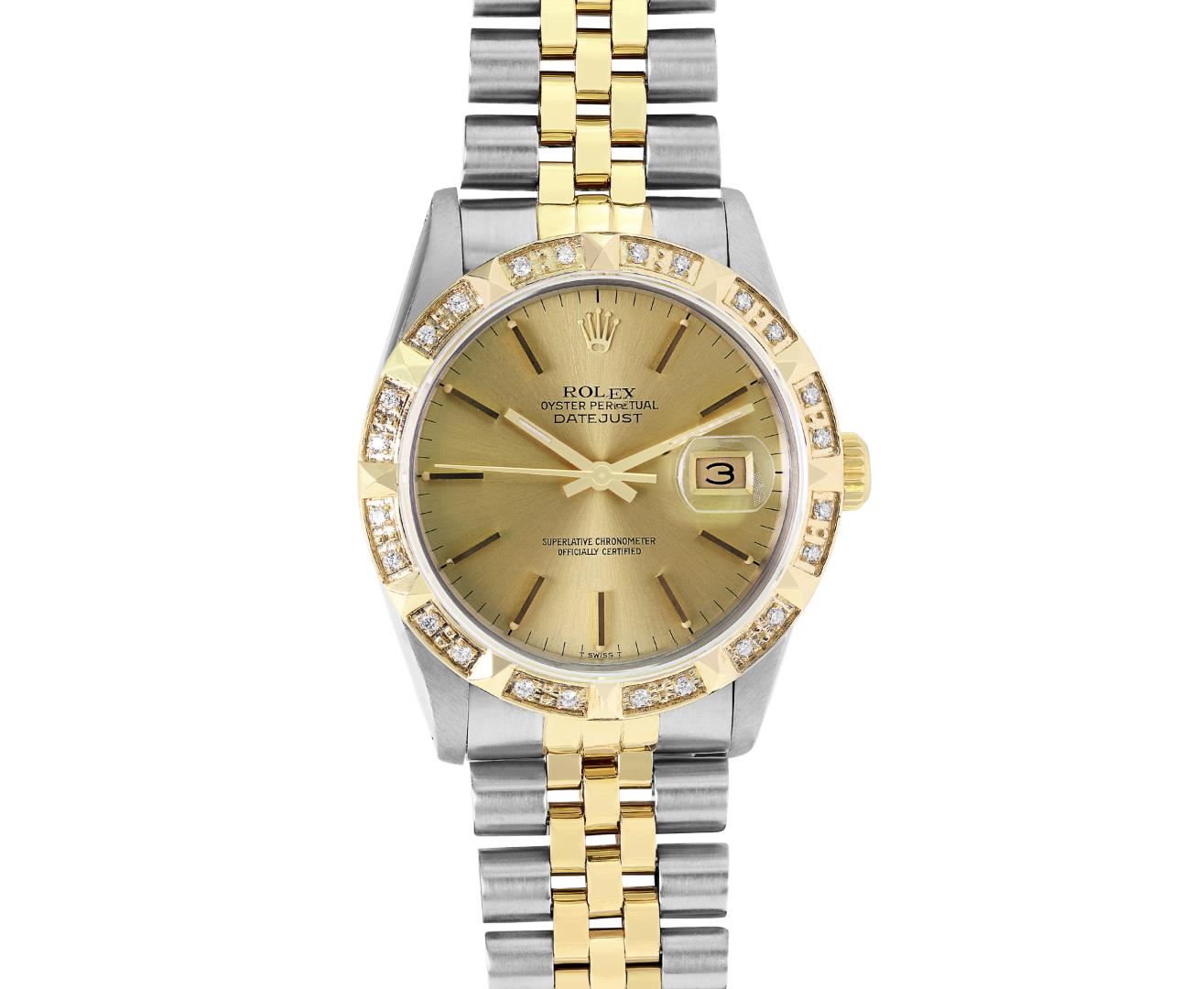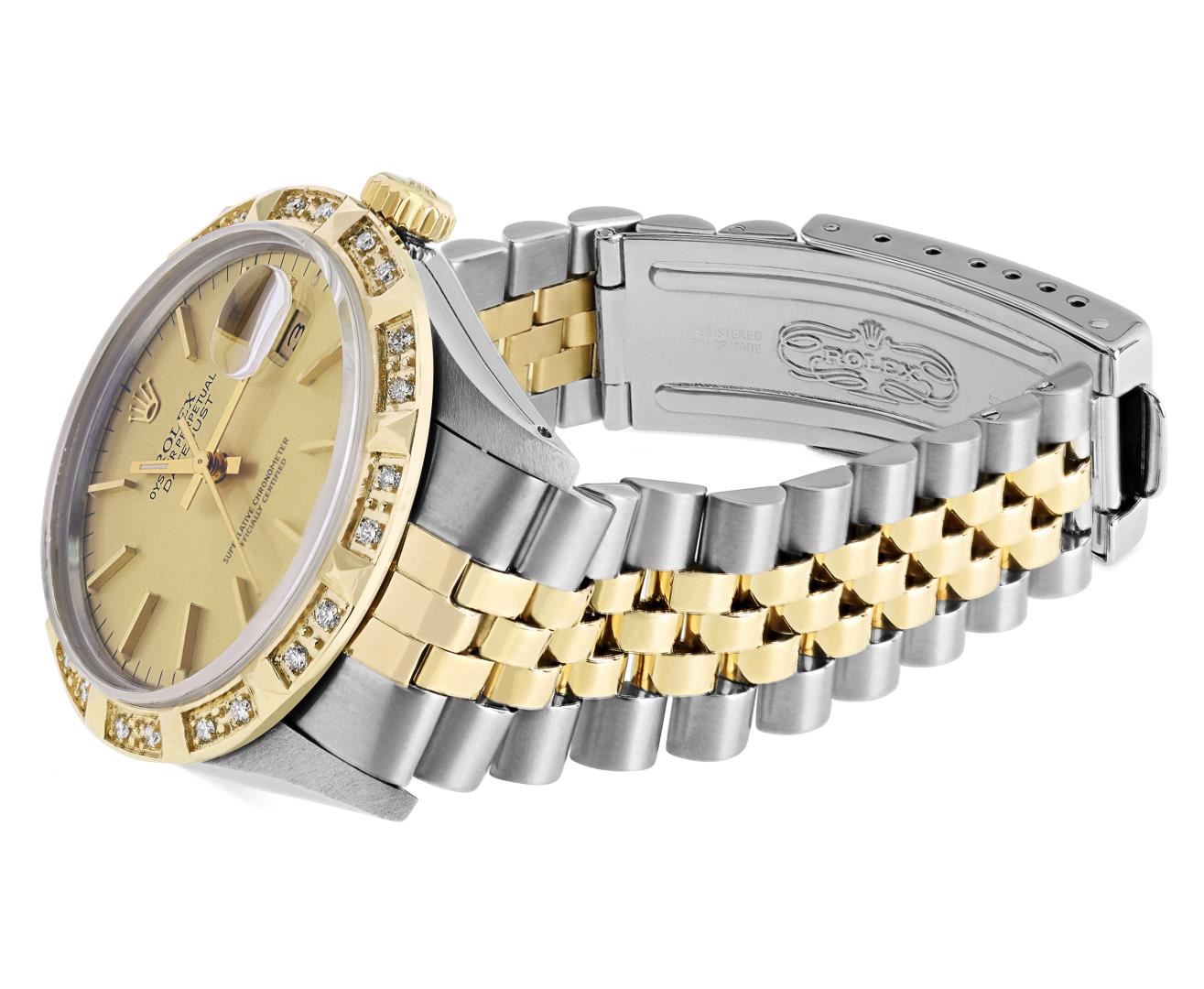 One Mens Pre Owned Yellow Gold Two Tone Rolex Datejust Polished, Serviced And Electronically Tested, Rolex Yellow Gold And Stainless Steel Case: 36mm, Rolex Yellow Gold Crown, Custom Bezel: New 18K Yellow Gold Pyramid Diamond Bezel, Diamond Count: 24 Diamonds. Custom Crystal: New Sapphire With Magnified Date Window. Custom Hands: New Luminecent Hands. Rolex Movement: Automatic Winding Movement 3035. Rolex Dial: Champagne Dial With Index Hour Markers and Dash Track With Lumi Dots. Date Window: 3 O'Clock Position Date Display, Quickset, Model: Quickset Datejust. Condition: G-6 Extra Fine. Rolex Bracelet: Two Tone Yellow Gold And Stainless Steel Jubilee Band. Bright Polish. 7.0 Inch Length, Adjustable. Standard Clasp, With Rolex Logo. This Watch Has Been Serviced Time Tested And Is In Excellent Condition It Is Free Of All Scratches And Dents. This Watch Comes With A Rolex Box.