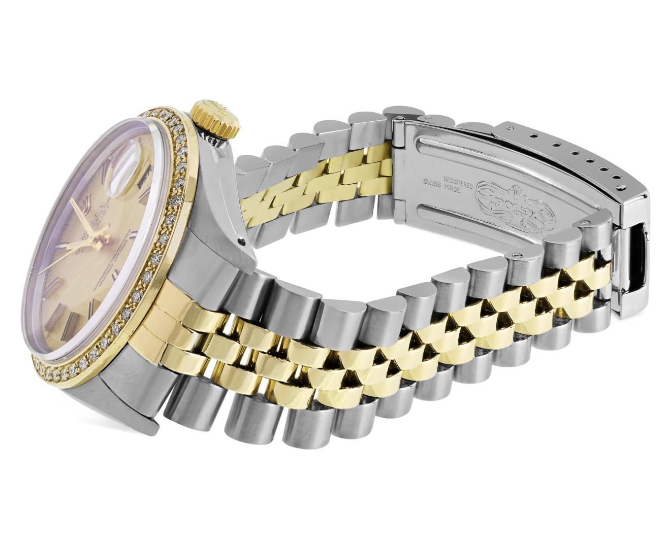 One Mens Pre Owned Yellow Gold And Steel Two Tone Rolex Datejust Polished, Serviced & Electronically Tested, Rolex Yellow Gold & Stainless Steel Case: 36mm, Rolex Yellow Gold Crown, Custom Bezel: New 18K Yellow Gold Beadset Diamond Bezel, Diamond Count: 44 Diamonds, Clarity: SI-VS, Color: G to H. Custom Crystal: New Sapphire With Magnified Date Window. Custom Hands: New Luminecent Hands. Rolex Movement: Automatic Winding Movement 3035. Rolex Dial: Champagne Dial With Index Hour Markers and Dash Track With Lumi Dots. Date Window: 3 O'Clock Position Date Display, Quickset, Model: Quickset Datejust. Condition: G-6 Extra Fine. Rolex Bracelet: Two Tone Yellow Gold & Stainless Steel Jubilee Band. Bright Polish. 7.0 Inch Length, Adjustable. Fold Clasp, With Rolex Logo. This Watch Has Been Serviced Time Tested And Is In Excellent Condition It Is Free Of All Scratches And Dents. This Watch Comes With A Rolex Box.