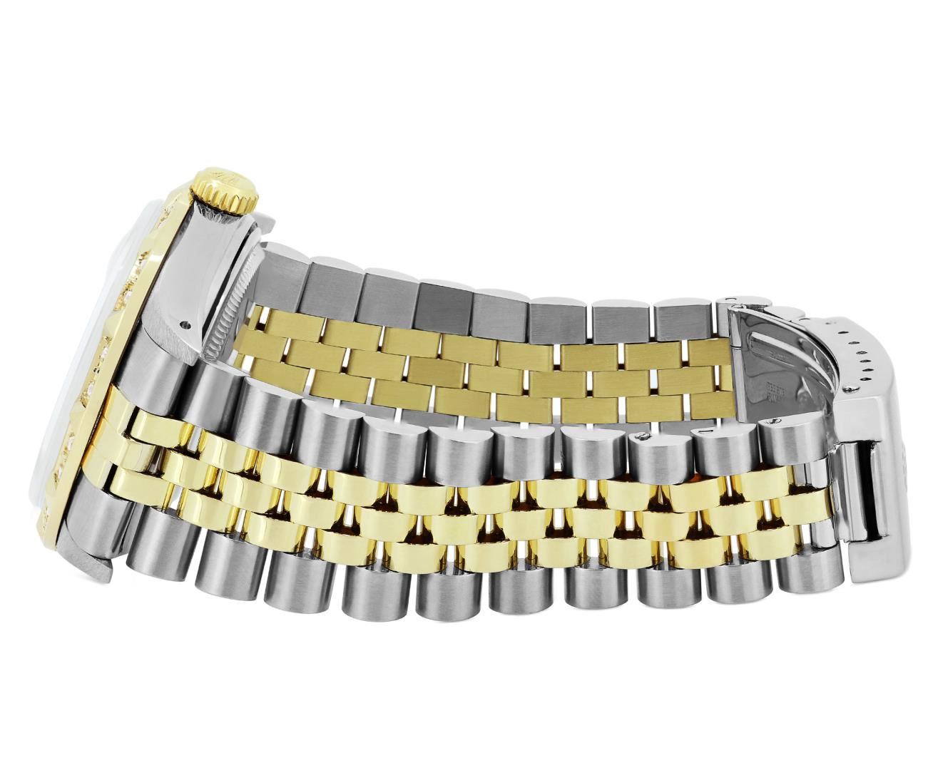 One Mens Pre Owned Yellow Gold And Steel Two Tone Rolex Datejust Polished, Serviced & Electronically Tested, Rolex Yellow Gold & Stainless Steel Case: 36mm, Rolex Yellow Gold Crown, Custom Bezel: New 18K Yellow Gold Pyramid Diamond Bezel, Diamond Count: 24 Diamonds On Dial, Total Weight .75 Carat, Clarity: SI-VS, Color: G to H. Custom Crystal: New Sapphire With Magnified Date Window. Custom Hands: New Luminescent Hands. Rolex Movement: Automatic Winding Movement 3035. Rolex Dial: Champagne Dial With Index Hour Markers and Small Track With Lumi Dots. Date Window: 3 O'Clock Position Date Display, Quickset, Model: Quickset Datejust. Condition: G-6 Extra Fine. Rolex Bracelet: Two Tone Yellow Gold & Stainless Steel Jubilee Band. Bright Polish. 7.0 Inch Length, Adjustable. Fold Clasp, With Rolex Logo. This Watch Has Been Serviced Time Tested And Is In Excellent Condition It Is Free Of All Scratches And Dents. This Watch Comes With A Rolex Box.