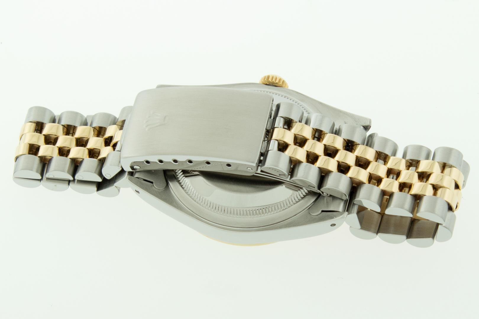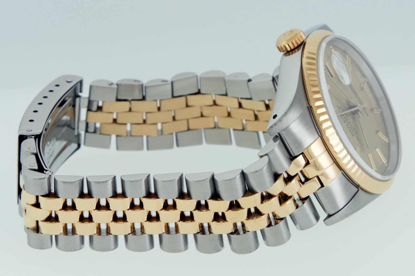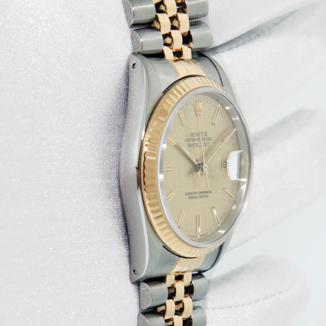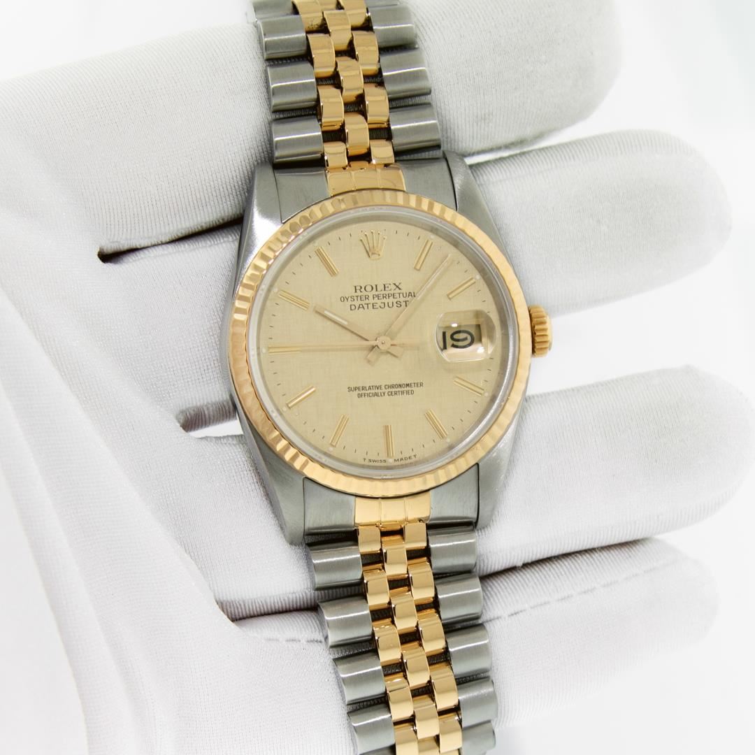 One Mens Pre Owned Yellow Gold Two Tone Rolex Datejust Polished, Serviced & Electronically Tested, Rolex Yellow Gold & Stainless Steel Case: 36mm, Rolex Yellow Gold Crown, Rolex Bezel: Yellow Gold Fluted Bezel. Custom Crystal: New Plastic With Magnified Date Window. Custom Hands: New Luminecent Hands. Rolex Movement: Automatic Winding Movement. Rolex Dial: Champagne Linen Dial With Index Hour Markers and Small Track With Lumi Dots. Date Window: 3 O'Clock Position Date Display, Quickset, Model: Datejust. Condition: G-6 Extra Fine. Rolex Bracelet: Two Tone Yellow Gold & Stainless Steel Jubilee Band. Bright Polish. 7.0 Inch Length, Adjustable. Standard Clasp, With Rolex Logo. This Watch Has Been Serviced Time Tested And Is In Excellent Condition It Is Free Of All Scratches And Dents.