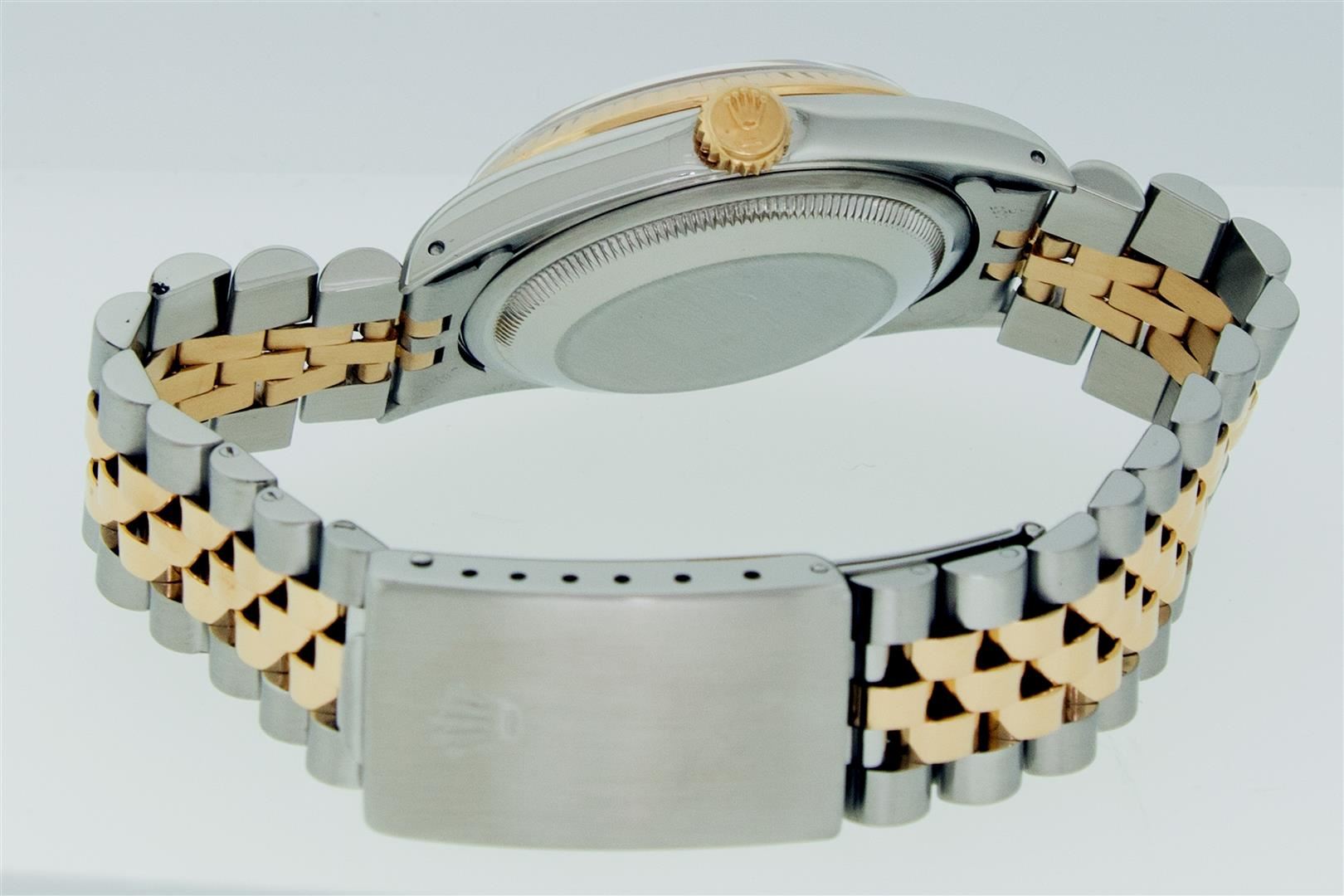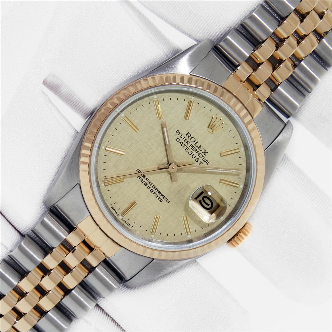 One Mens Yellow Gold Two Tone Rolex Datejust Polished, Serviced & Electronically Tested, Yellow Gold & Stainless Steel Case: 36mm, 14K Yellow Gold Crown, Bezel: Yellow Gold Fluted Bezel. Custom Crystal: New Acrylic Cyclops Lens. Custom Hands: New Luminece