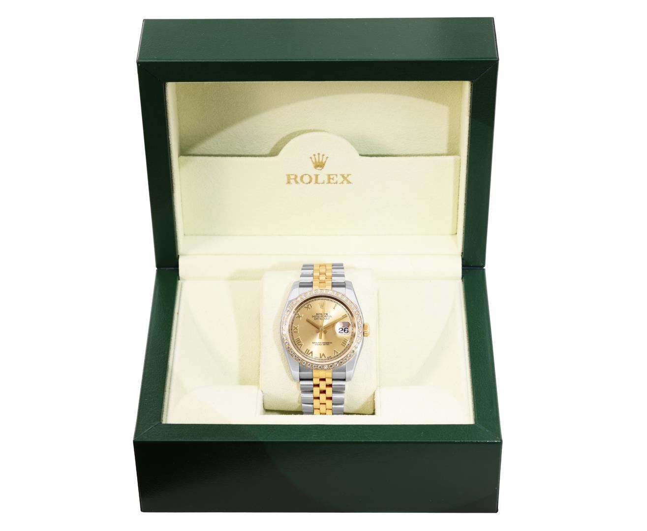 One Mens Pre Owned Quickset Sapphire 18K Yellow Gold And Stainless Steel Rolex Datejust 36MM Polished, Serviced And Electronically Tested, Rolex Yellow Gold And Stainless Steel Case: 36mm, Rolex Yellow Gold Crown, Custom Bezel: New 18K Yellow Gold Beadset Diamond Bezel, Diamond Count: 44 Diamonds. Crystal: Sapphire With Magnified Date Window. Hands: Solid Hands. Rolex Movement: Automatic Winding Movement 3135. Rolex Dial: Factory Champagne Dial With Roman Hour Markers. Date Window: 3 O'Clock Position Date Display, Quickset, Model: 116233 Datejust. Condition: G-6 Extra Fine. Rolex Bracelet: Two Tone 18K Yellow Gold And Stainless Steel Jubilee Band. Bright Polish. 7.0 Inch Length, Adjustable. Hidden Clasp, With Rolex Logo. This Watch Has Been Serviced And Polished It Is Free Of All Scratches And Dents. This Watch Comes With A Role Box.