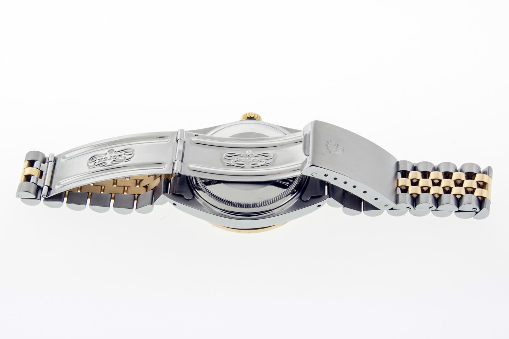 One Mens Pre Owned Yellow Gold Two Tone Rolex Datejust Polished, Serviced & Electronically Tested, Yellow Gold & Stainless Steel Case: 36mm, Rolex Yellow Gold Crown, Custom Bezel: New 18K Yellow Gold Ruby Beadset Diamond Bezel, Diamond Count: 36 Diamonds + 4 Rubies. Custom Crystal: New Sapphire With Magnified Date Window. Custom Hands: New Hands. Rolex Movement: Automatic Winding Movement. Rolex Factory Dial: Champagne Dial With Diamond Hour Markers. Diamond Count: 10 Diamonds In Dial. Date Window: 3 O'Clock Position Date Display, Quickset, Model: Datejust. Condition: G-6 Extra Fine. Rolex Bracelet: Two Tone Yellow Gold & Stainless Steel Jubilee Band. Bright Polish. 7.0 Inch Length, Adjustable. Standard Clasp, With Rolex Logo. This Pre Owned Watch Has Been Serviced Time Tested And Is In Excellent Condition It Is Free Of All Scratches And Dents.