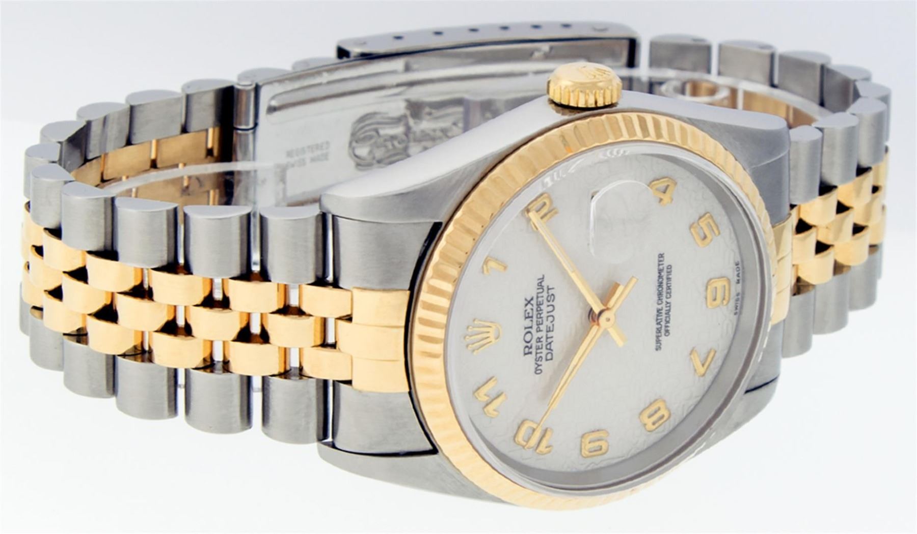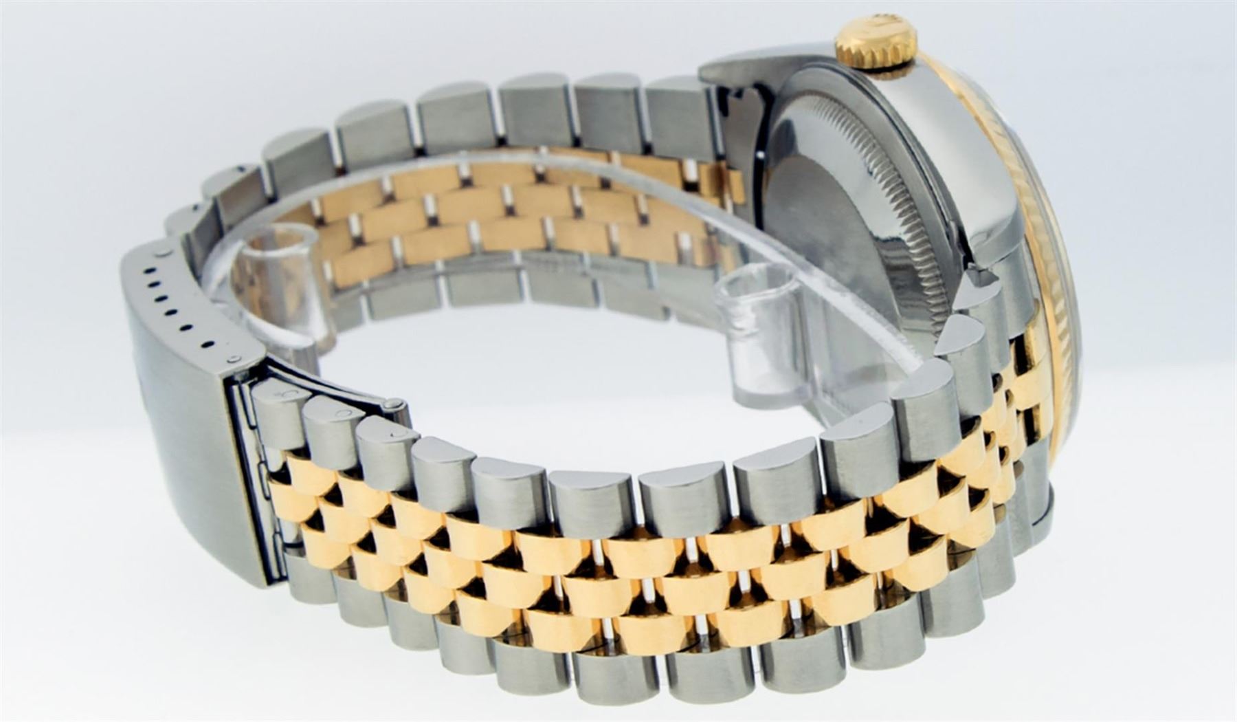 One Mens Rolex Two Tone 18K Yellow Gold And Stainless Steel Datejust Polished, Serviced & Electronically Tested, Yellow Gold & Stainless Steel Case: 36mm, 18K Yellow Gold Crown, Rolex Bezel: 18K Yellow Gold Fluted Bezel. Crystal: Sapphire With Magnified Date Window. Custom Hands: New Luminescent Hands. Rolex Movement: Automatic Winding Movement 3135. Rolex Dial: Cream Jubilee Dial With Arabic Hour Markers. Date Window: 3 O'Clock Position Date Display, Quickset, Model: Datejust. Condition: G-6 Extra Fine. Rolex Bracelet: Two Tone 18K Yellow Gold & Stainless Steel Jubilee Band. Bright Polish. 7.0 Inch Length, Adjustable. Standard Clasp, With Rolex Logo. This Watch Has Been Serviced Time Tested And Is In Excellent Condition It Is Free Of All Scratches And Dents.