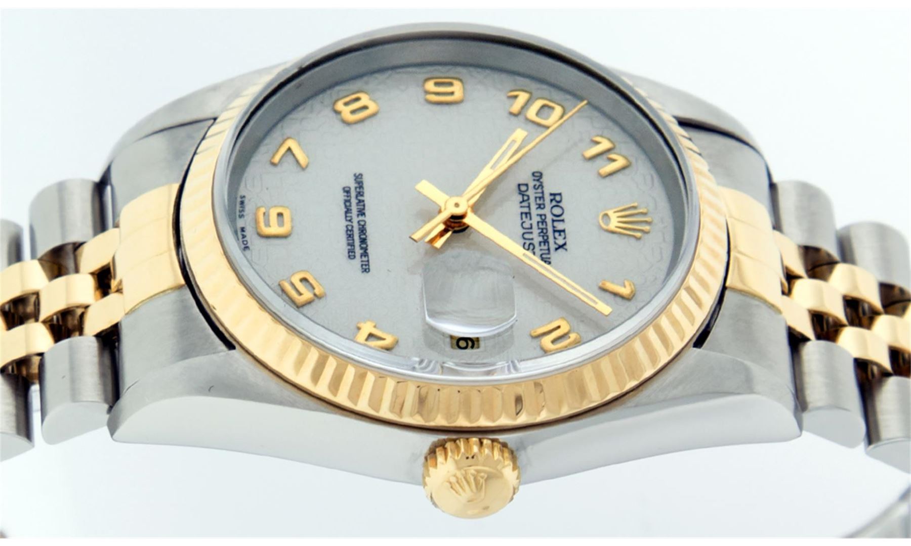One Mens Rolex Two Tone 18K Yellow Gold And Stainless Steel Datejust Polished, Serviced & Electronically Tested, Yellow Gold & Stainless Steel Case: 36mm, 18K Yellow Gold Crown, Rolex Bezel: 18K Yellow Gold Fluted Bezel. Crystal: Sapphire With Magnified Date Window. Custom Hands: New Luminescent Hands. Rolex Movement: Automatic Winding Movement 3135. Rolex Dial: Cream Jubilee Dial With Arabic Hour Markers. Date Window: 3 O'Clock Position Date Display, Quickset, Model: Datejust. Condition: G-6 Extra Fine. Rolex Bracelet: Two Tone 18K Yellow Gold & Stainless Steel Jubilee Band. Bright Polish. 7.0 Inch Length, Adjustable. Standard Clasp, With Rolex Logo. This Watch Has Been Serviced Time Tested And Is In Excellent Condition It Is Free Of All Scratches And Dents.