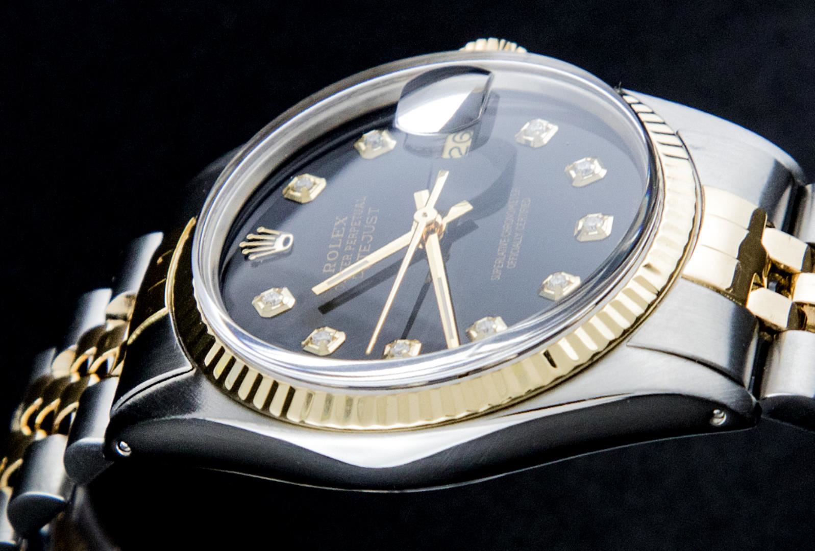 One Mens Pre Owned Rolex Two Tone Yellow Gold And Stainless Steel Datejust Polished, Serviced & Electronically Tested, Rolex Yellow Gold & Stainless Steel Case: 36mm, Rolex Yellow Gold Crown, Rolex Bezel: Yellow Gold Fluted Bezel. Custom Crystal: New Acrylic With Magnified Date Window. Custom Hands: New Luminecent Hands. Rolex Movement: Automatic Winding Movement. Custom Dial: Custom Black Dial With Added Diamond Hour Markers, Diamond Count: 10 Diamonds In Dial. Date Window: 3 O'Clock Position Date Display, Quickset, Model: Condition: G-6 Extra Fine. Rolex Bracelet: Two Tone Yellow Gold & Stainless Steel Jubilee Band. Bright Polish. 7.0 Inch Length, Adjustable. Standard Clasp, With Rolex Logo. This Watch Has Been Serviced Time Tested And Is In Excellent Condition It Is Free Of All Scratches And Dents.