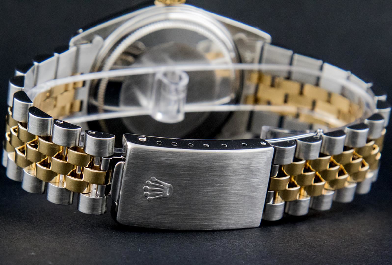 One Mens Pre Owned Rolex Two Tone Yellow Gold And Stainless Steel Datejust Polished, Serviced & Electronically Tested, Rolex Yellow Gold & Stainless Steel Case: 36mm, Rolex Yellow Gold Crown, Rolex Bezel: Yellow Gold Fluted Bezel. Custom Crystal: New Acrylic With Magnified Date Window. Custom Hands: New Luminecent Hands. Rolex Movement: Automatic Winding Movement. Custom Dial: Custom Black Dial With Added Diamond Hour Markers, Diamond Count: 10 Diamonds In Dial. Date Window: 3 O'Clock Position Date Display, Quickset, Model: Condition: G-6 Extra Fine. Rolex Bracelet: Two Tone Yellow Gold & Stainless Steel Jubilee Band. Bright Polish. 7.0 Inch Length, Adjustable. Standard Clasp, With Rolex Logo. This Watch Has Been Serviced Time Tested And Is In Excellent Condition It Is Free Of All Scratches And Dents.