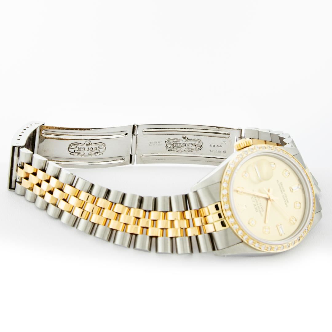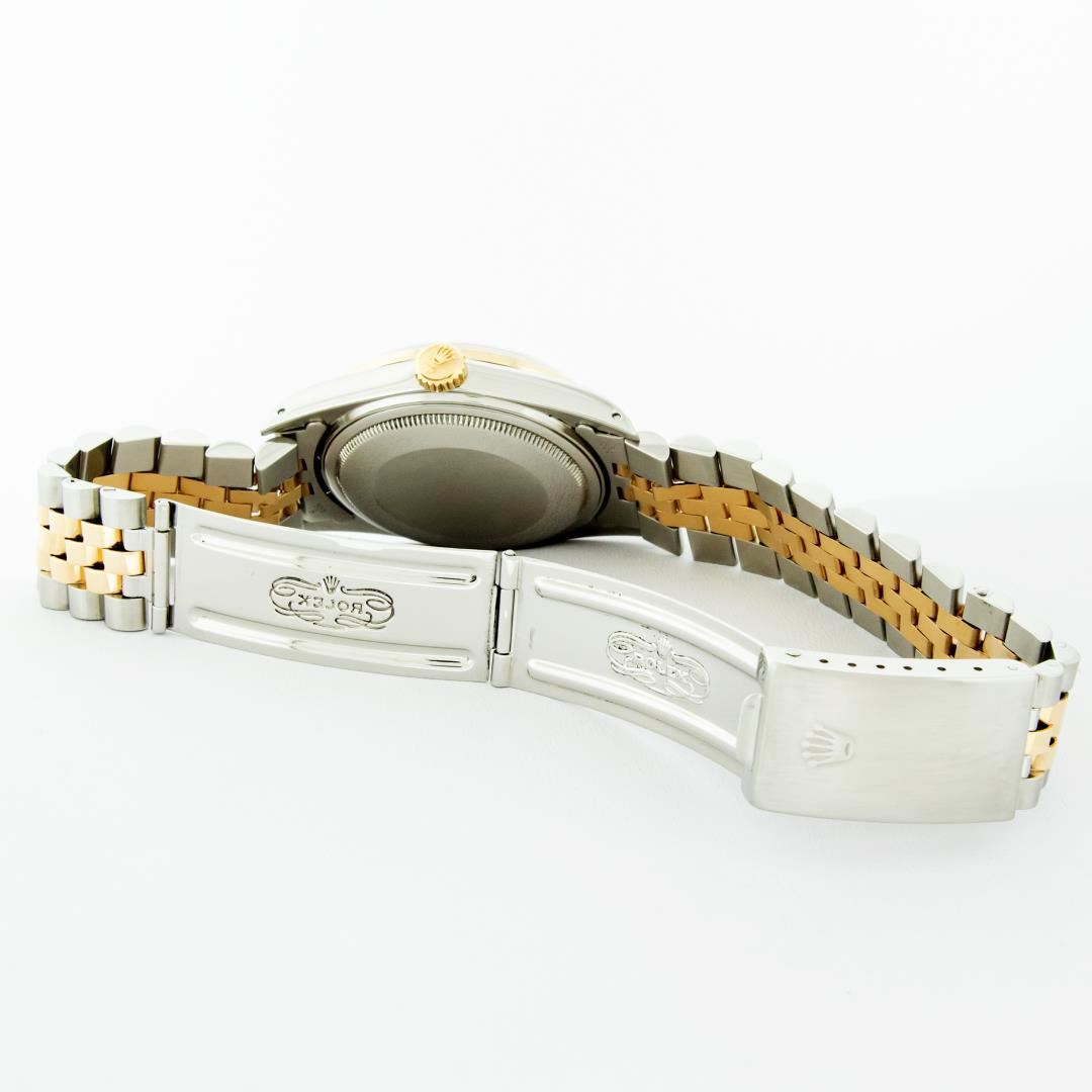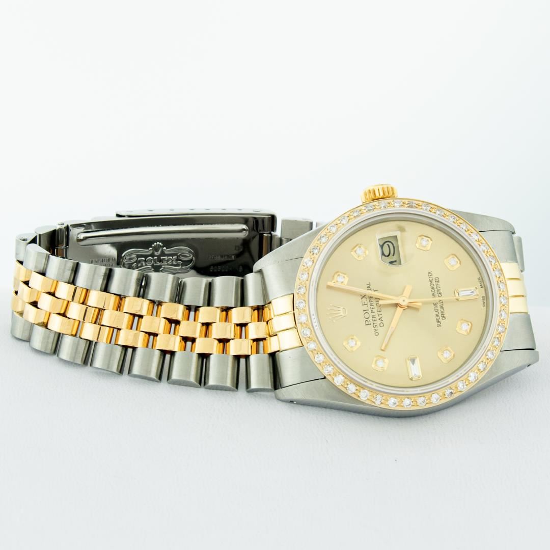 One Mens Pre Owned Two Tone Yellow Gold And Stainless Steel Rolex Datejust Polished, Serviced And Electronically Tested, Rolex 18K Yellow Gold And Stainless Steel Case: 36mm, Rolex 18K Yellow Gold Crown, Custom Bezel: New 18K Yellow Gold Beadset Diamond Bezel, Diamond Count: 44 Diamonds. Custom Crystal: New Sapphire With Magnified Lens. Custom Hands: New Luminescent Hands. Rolex Movement: Automatic Winding Movement 3035. Custom Dial: Custom Champagne Dial Added Diamonds, Diamond Count: 8 + 2 Baguette Diamonds On Dial. Date Window: 3 O'Clock Position Date Display, Quickset, Model: Datejust. Condition: G-6 Extra Fine. Rolex Bracelet: Two Tone Yellow Gold And Stainless Steel Jubilee Band. Bright Polish. 7.0 Inch Length, Adjustable. Standard Clasp, With Rolex Logo. This Watch Has Been Serviced Time Tested And Is In Excellent Condition It Is Free Of All Scratches And Dents.