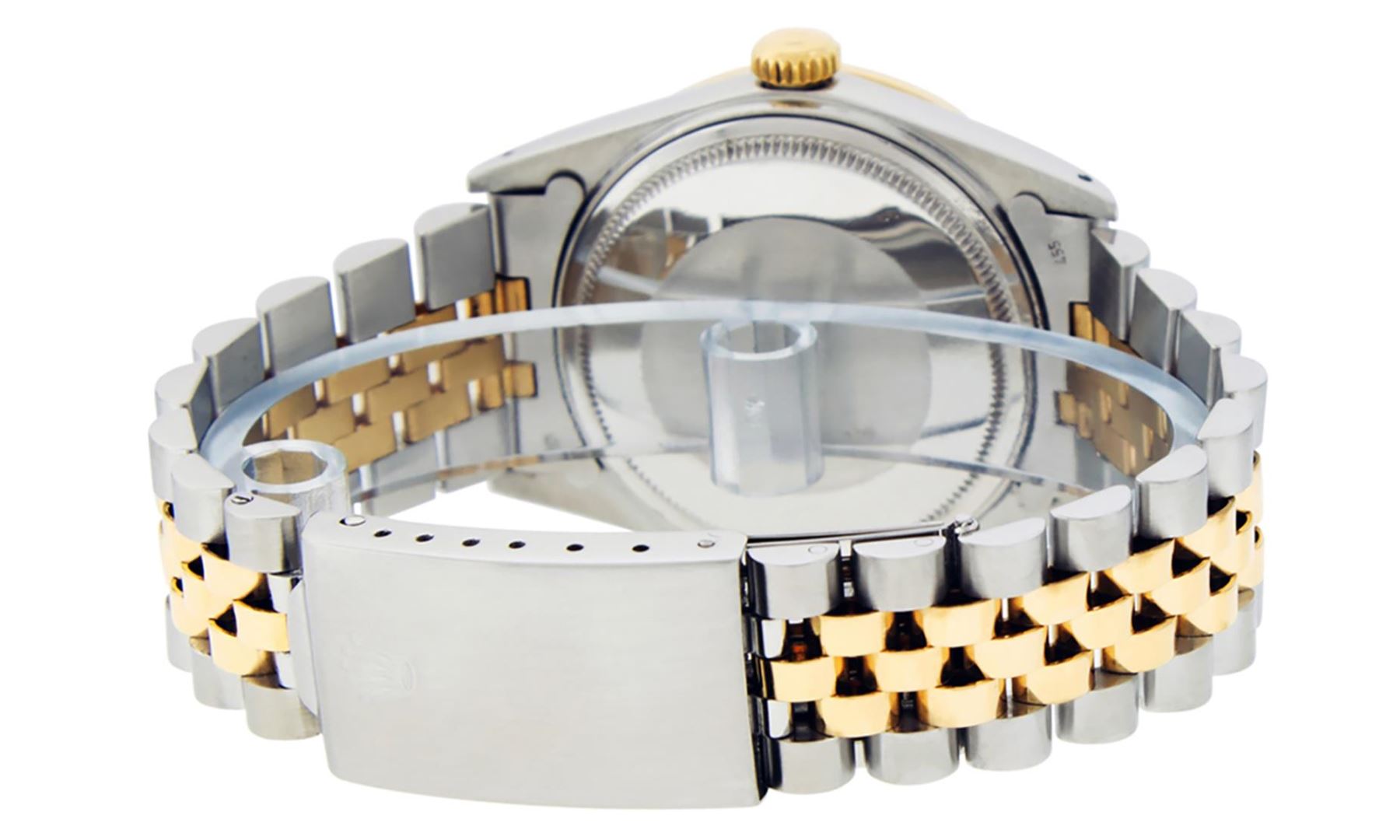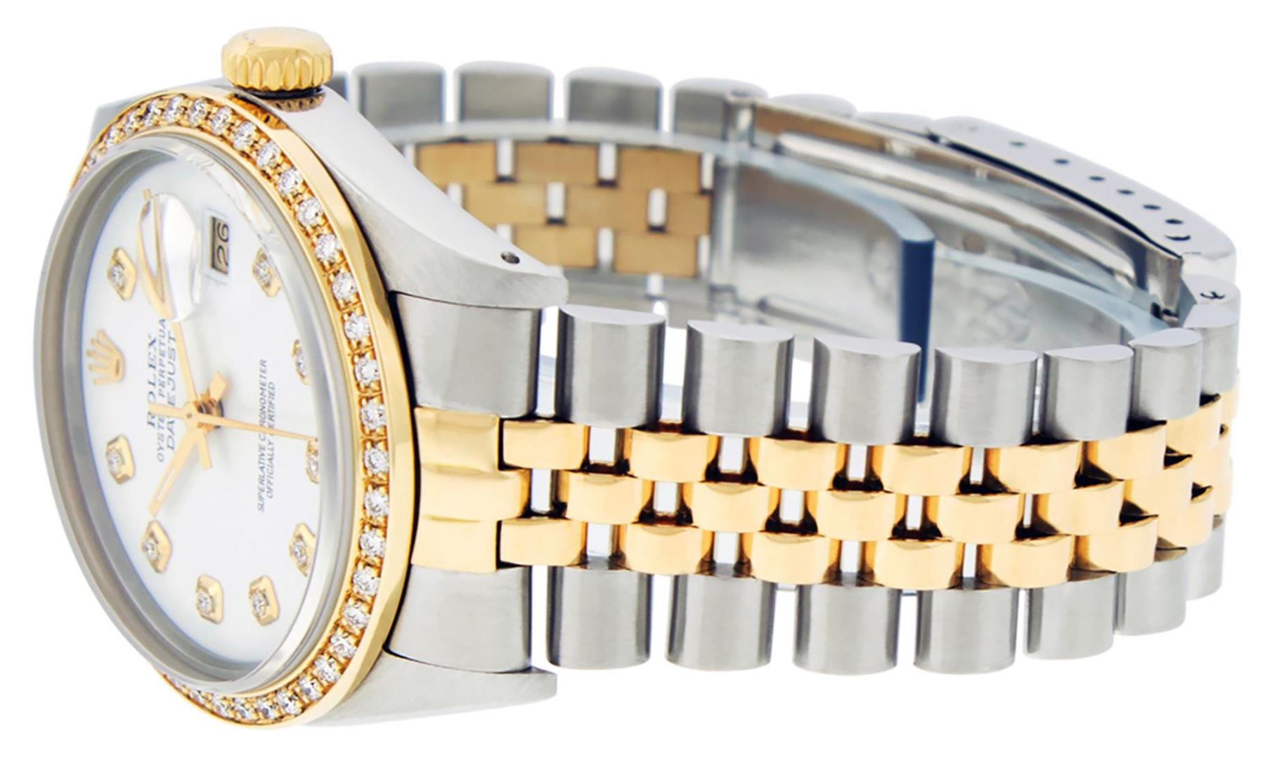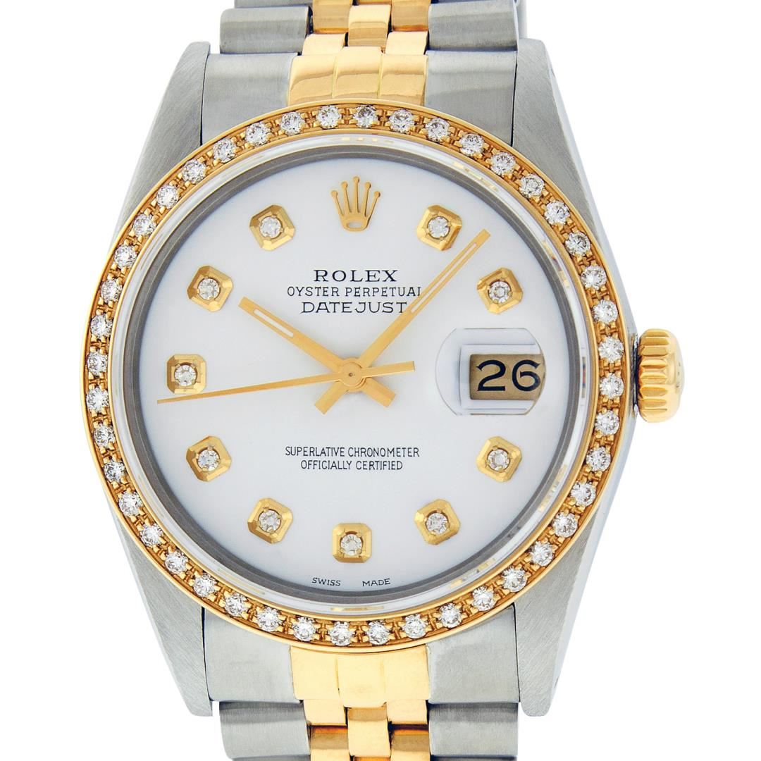 One Mens Pre Owned Rolex Yellow Gold And Steel Two Tone Rolex Datejust Polished, Serviced & Electronically Tested, Rolex Case: Yellow Gold & Stainless Steel Case: 36mm, Rolex Yellow Gold Crown, Custom Bezel: New 18K Yellow Gold Beadset Diamond Bezel, Diamond Count: 44 Diamonds. Custom Crystal: New Sapphire With Magnified Lens. Rolex Movement: Automatic Winding Movement 3035. Custom Dial: Custom White Diamond Dial With Added Diamonds, Diamond Count: 10 Diamonds On Dial. Date Window: 3 O'Clock Position Date Display, Quickset, Model: Datejust, Condition: G-6 Extra Fine. Rolex Bracelet: Two Tone Yellow Gold And Stainless Steel Jubilee Band. Bright Polish. 7.0 Inch Length, Adjustable. Standard Clasp, With Rolex Logo. This Watch Has Been Serviced Time Tested And Is In Excellent Condition It Is Free Of All Scratches And Dents.