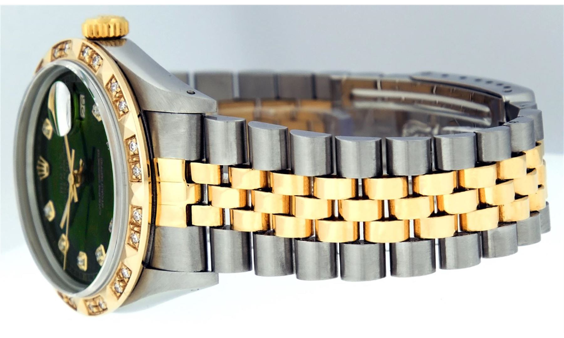 One Gents 18K Yellow Gold Two Tone Rolex Datejust Polished, Serviced & Electronically Tested, 18K Yellow Gold & Stainless Steel Case:36mm, Diamond Lugs On Case, Diamond Count: 16 Diamonds On Lugs, Color: G To H, Clarity: SI-VS. 18K Yellow Gold Crown, Custom Bezel: 18K Yellow Pyramid Diamond Bezel, Diamond Count: 24 Diamonds In Dial. Clarity: Si-VS, Color: G to H. Custom Crystal: Synthetic Sapphire Cyclops Lens. Movement: Automatic Winding Movement Caliber 3035. Custom Dial: Green Vignette Diamond Dial With Square Roman Track, Diamond Count: 10 Diamonds In Dial, Color: G To H, Clarity: SI-VS, Date Window: 3 O'Clock Position Date Display, Quickset, Model: 16013, Condition: G-6 Extra Fine The Watch Is In Very Good Condition Free Of All Scratches And Dents. Bracelet:Two Tone Yellow Gold & Stainless Steel Jubilee Band. Bright Polish. 7.0 Inch Length, Adjustable. Standard Clasp, With Rolex Logo.