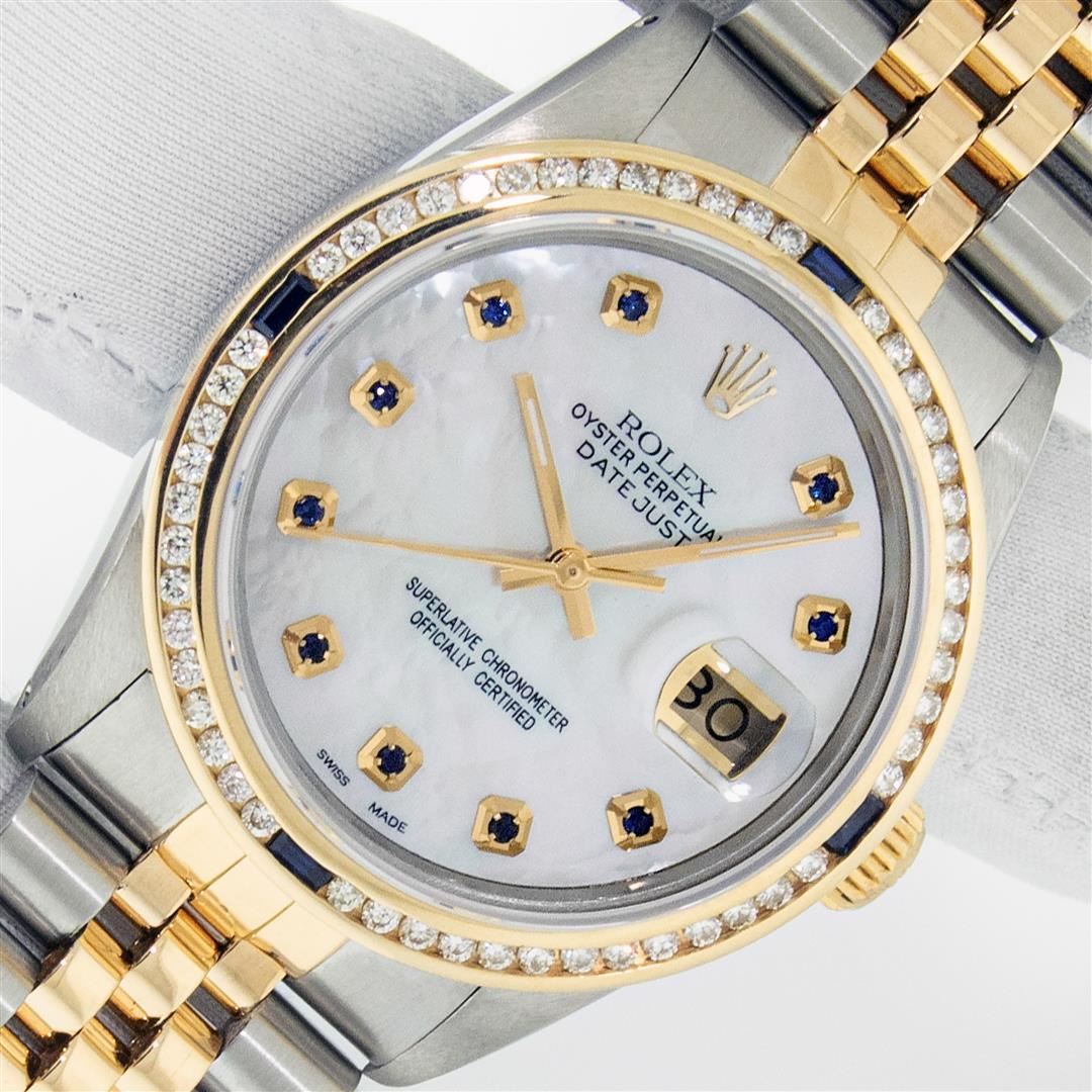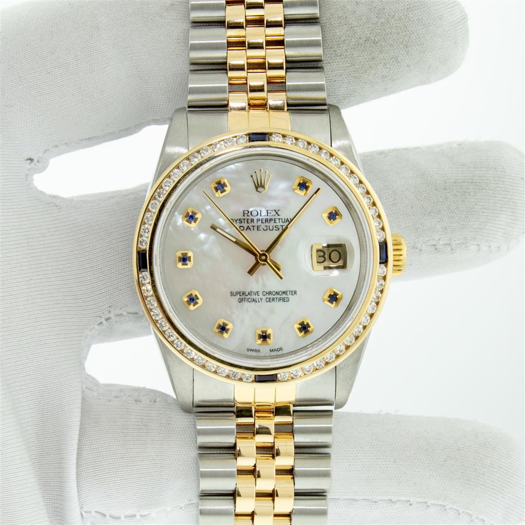 One Mens Yellow Gold Two Tone Rolex Datejust Polished, Serviced & Electronically Tested, Yellow Gold & Stainless Steel Case: 36mm, Yellow Gold Crown, Custom Bezel: 18K Yellow Gold Sapphire Channel Set Diamond Bezel, Diamond Count: 52 Diamonds + 4 Sapphire