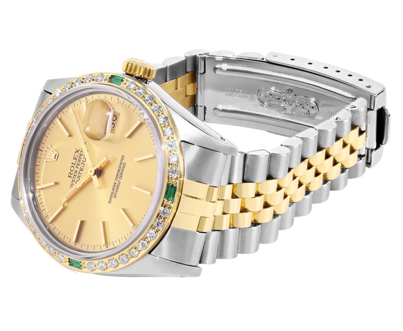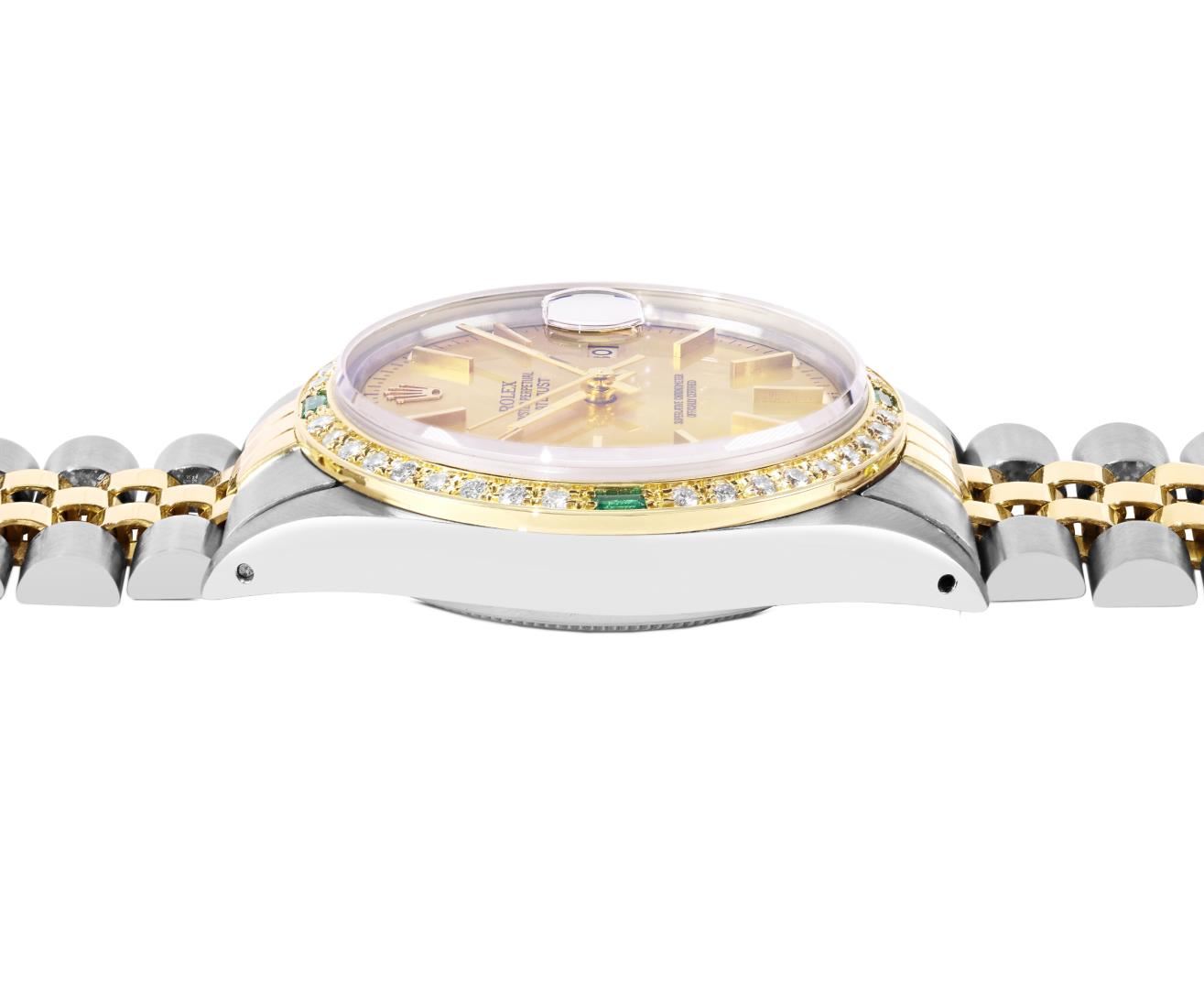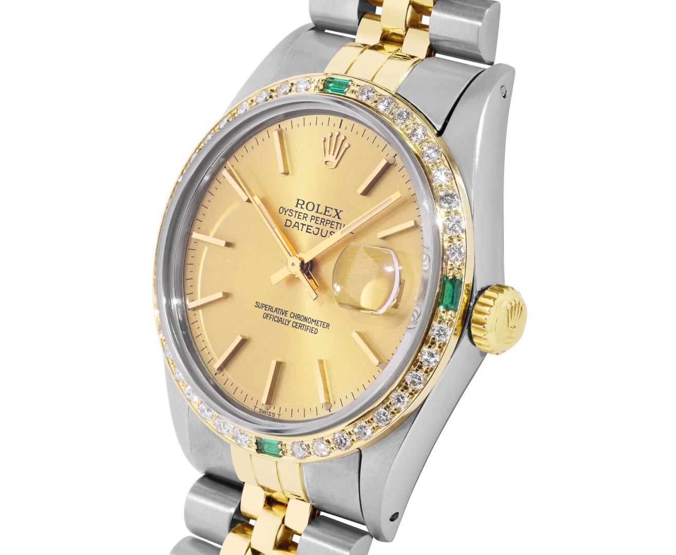 One Mens Pre Owned Two Tone Yellow Gold & Stainless Steel Rolex Datejust Polished, Serviced & Electronically Tested, Yellow Gold & Stainless Steel Case: 36mm, Rolex Yellow Gold Crown, Custom Bezel: New 18K Yellow Gold Emerald Beadset Diamond Bezel, Diamond Count: 36 Diamonds + 4 Emeralds, Clarity: SI-VS, Color: G to H. Custom Crystal: New Sapphire With Magnified Date Window. Custom Hands: New Lumi Hands. Rolex Movement: Automatic Winding Movement 3035. Rolex Factory Dial: Champagne Index Dial With Dash Track & Lumi Dots. Date Window: 3 O'Clock Position Date Display, Quickset, Model: Quickset Datejust. Condition: G-6 Extra Fine. Rolex Bracelet: Two Tone Yellow Gold & Stainless Steel Jubilee Band. Bright Polish. 7.0 Inch Length, Adjustable. Fold Clasp, With Rolex Logo. This Watch Has Been Serviced Time Tested And Is In Excellent Condition It Is Free Of All Scratches And Dents. This Watch Comes With A Rolex Box.