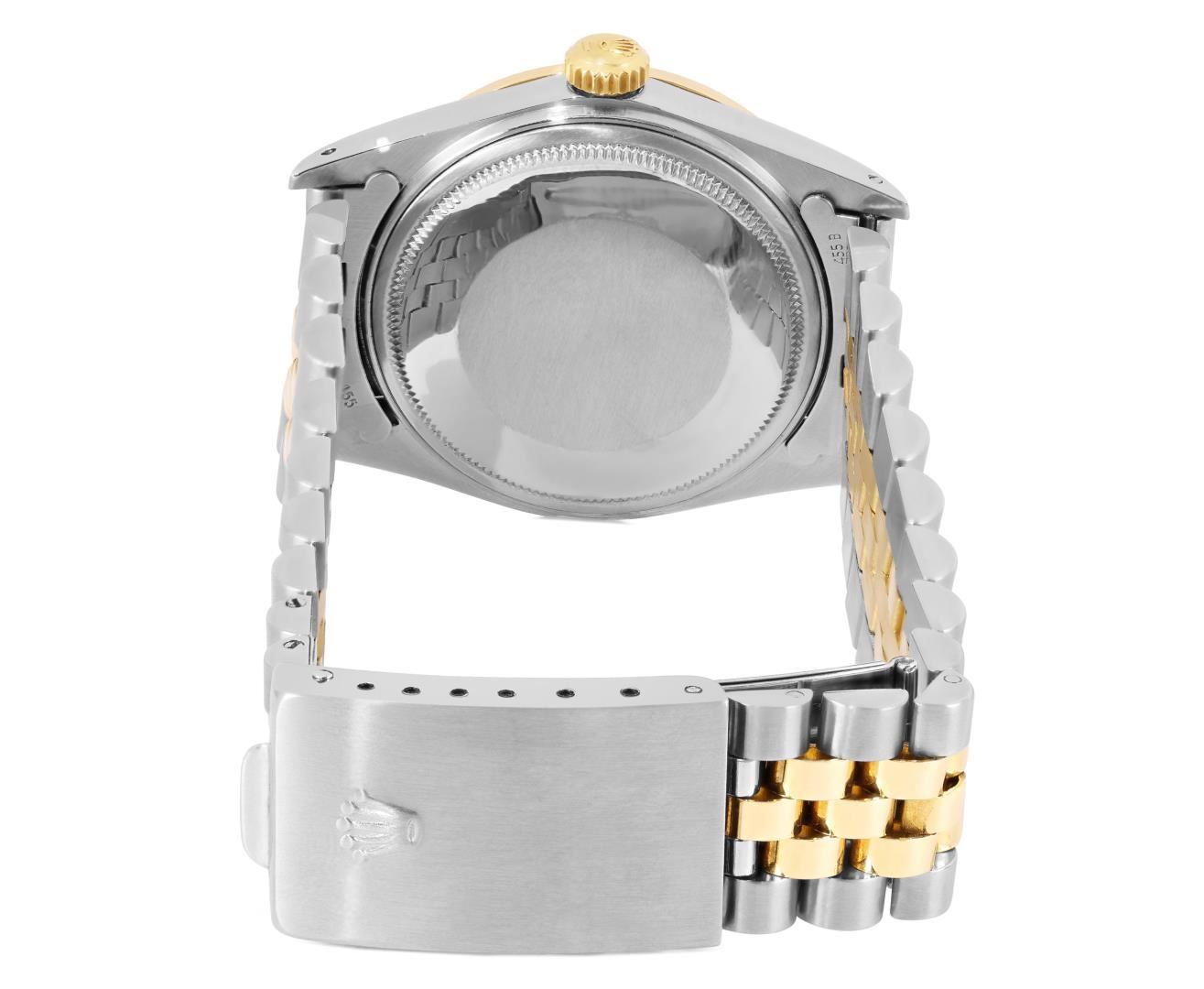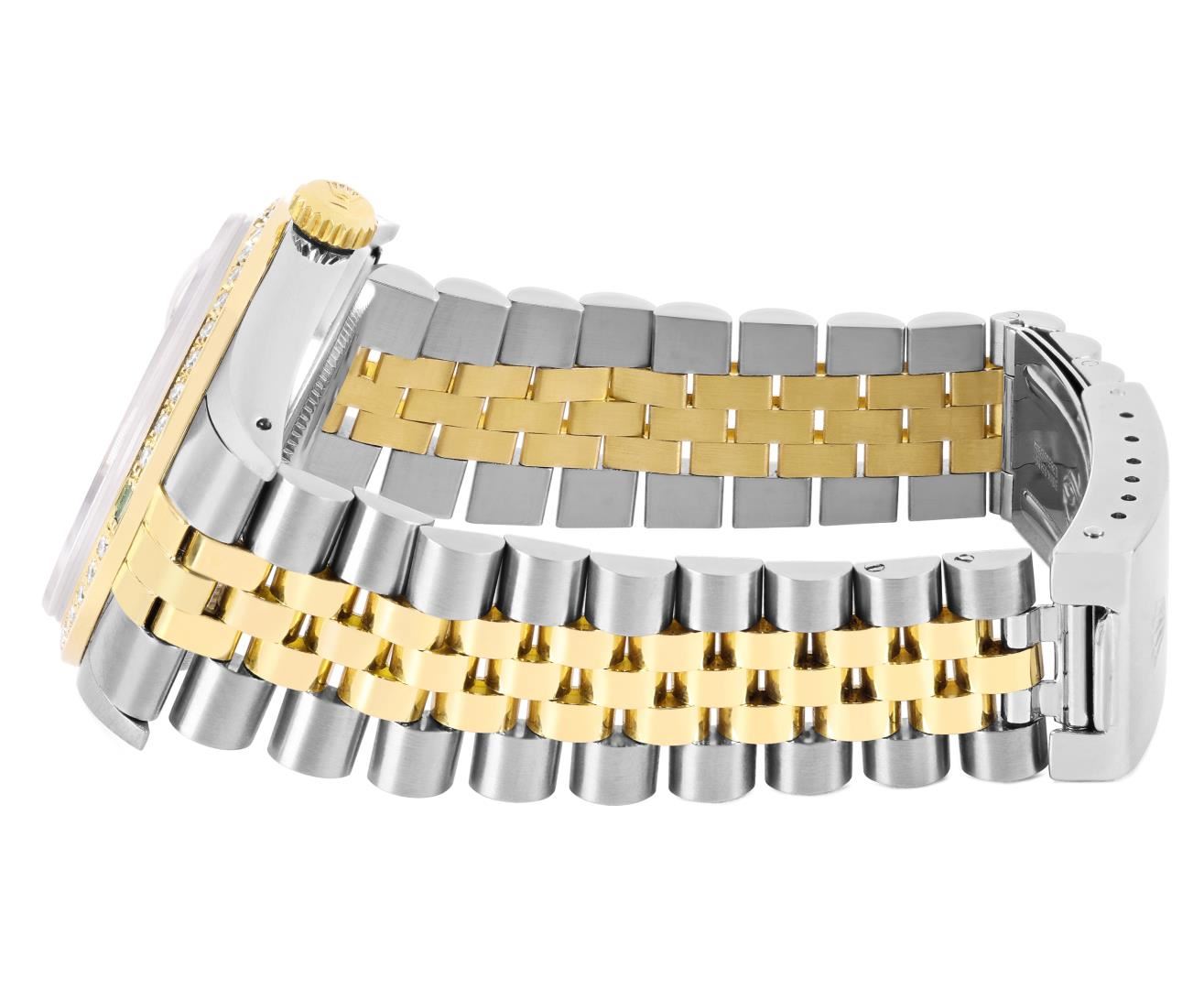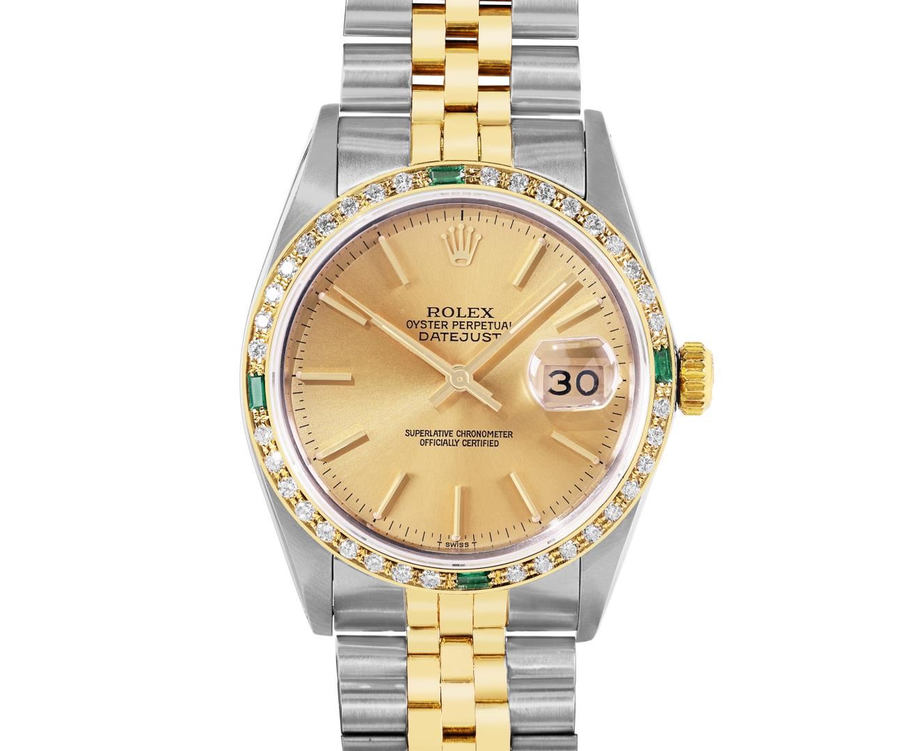 One Mens Pre Owned Two Tone Yellow Gold & Stainless Steel Rolex Datejust Polished, Serviced & Electronically Tested, Yellow Gold & Stainless Steel Case: 36mm, Rolex Yellow Gold Crown, Custom Bezel: New 18K Yellow Gold Emerald Beadset Diamond Bezel, Diamond Count: 36 Diamonds + 4 Emeralds, Clarity: SI-VS, Color: G to H. Custom Crystal: New Sapphire With Magnified Date Window. Custom Hands: New Lumi Hands. Rolex Movement: Automatic Winding Movement 3035. Rolex Factory Dial: Champagne Index Dial With Dash Track & Lumi Dots. Date Window: 3 O'Clock Position Date Display, Quickset, Model: Quickset Datejust. Condition: G-6 Extra Fine. Rolex Bracelet: Two Tone Yellow Gold & Stainless Steel Jubilee Band. Bright Polish. 7.0 Inch Length, Adjustable. Fold Clasp, With Rolex Logo. This Watch Has Been Serviced Time Tested And Is In Excellent Condition It Is Free Of All Scratches And Dents. This Watch Comes With A Rolex Box.