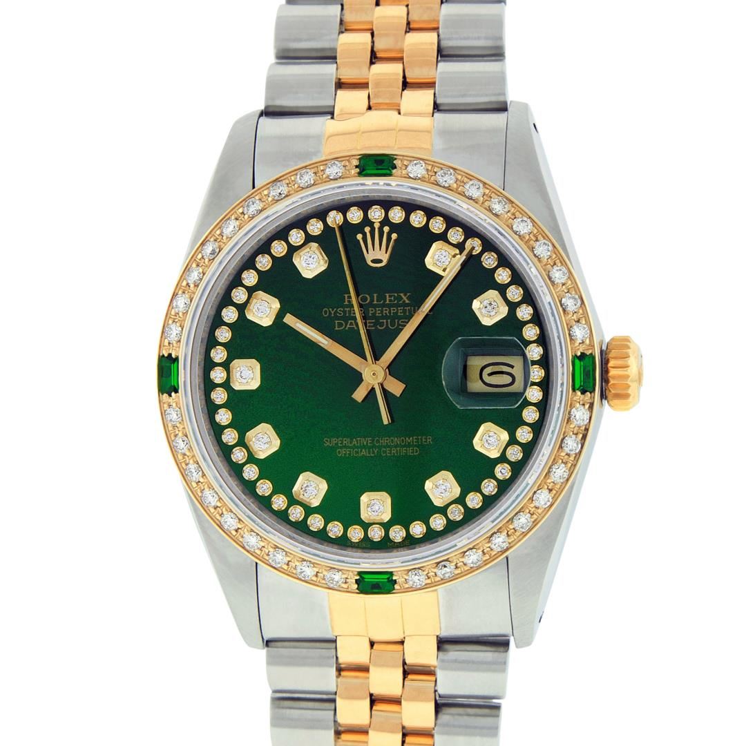 One Mens Pre Owned Two Tone Yellow Gold And Stainless Steel Rolex Datejust Polished, Serviced And Electronically Tested, Rolex Yellow Gold And Stainless Steel Case: 36mm, Rolex Yellow Gold Crown, Custom Bezel: New 18K Yellow Gold Emerald Beadset Diamond Bezel, Diamond Count: 36 Diamonds + 4 Emeralds. Custom Crystal: New Sapphire With Date Window. Custom Hands: New Luminescent Hands. Rolex Movement: Automatic Winding Movement 3035. Custom Dial: Custom Green Dial With Added Diamonds, Diamond Count: 58 Diamonds On Dial. Date Window: 3 O'Clock Position Date Display, Quickset, Model: Quickset Datejust. Condition: G-6 Extra Fine. Rolex Bracelet: Two Tone Yellow Gold And Stainless Steel Jubilee Band. Bright Polish. 7.0 Inch Length, Adjustable. Standard Clasp, With Rolex Logo. This Watch Has Been Serviced Time Tested And Is In Excellent Condition It Is Free Of All Scratches And Dents.