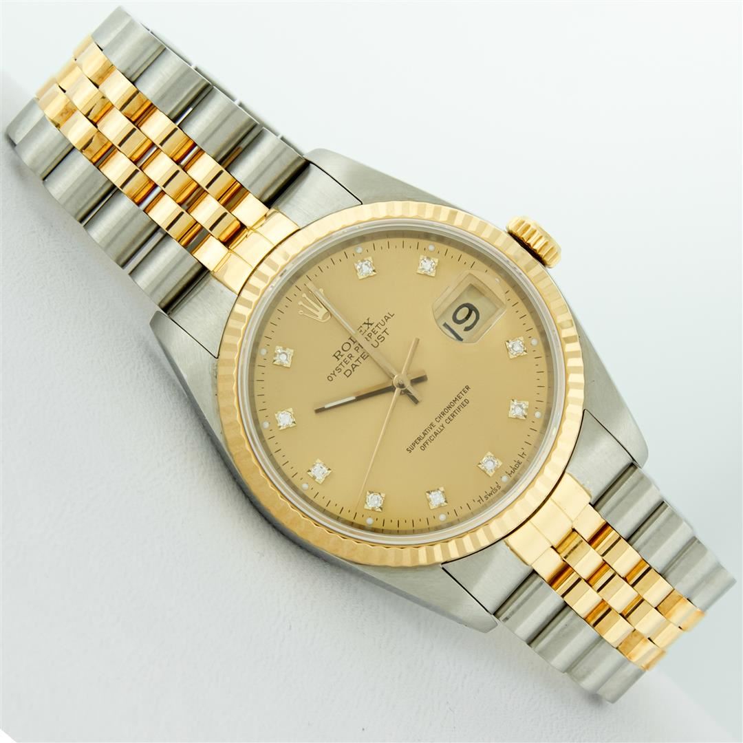 One Mens Yellow Gold Two Tone Rolex Datejust Polished, Serviced & Electronically Tested, Yellow Gold & Stainless Steel Case: 36mm, Yellow Gold Crown, Bezel: Original Rolex Yellow Gold Fluted Bezel, Custom Crystal: New Acrylic Crystal Lens. Hands: Luminesc
