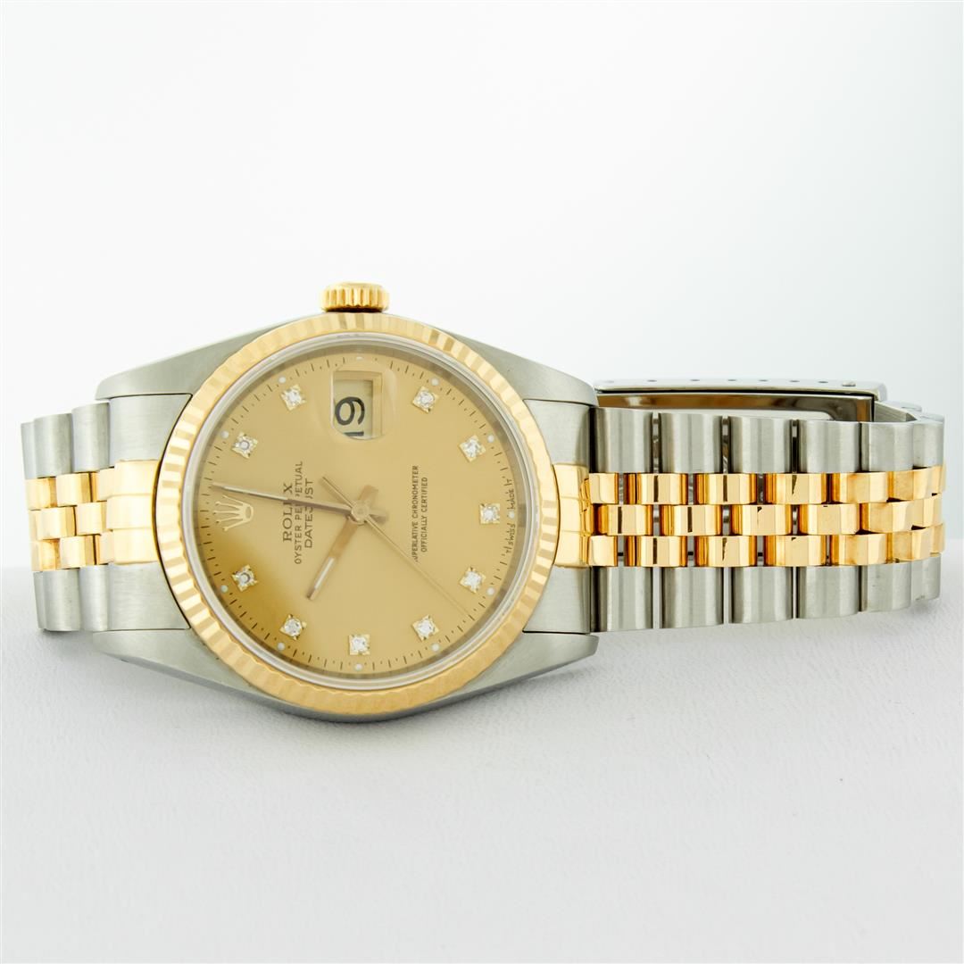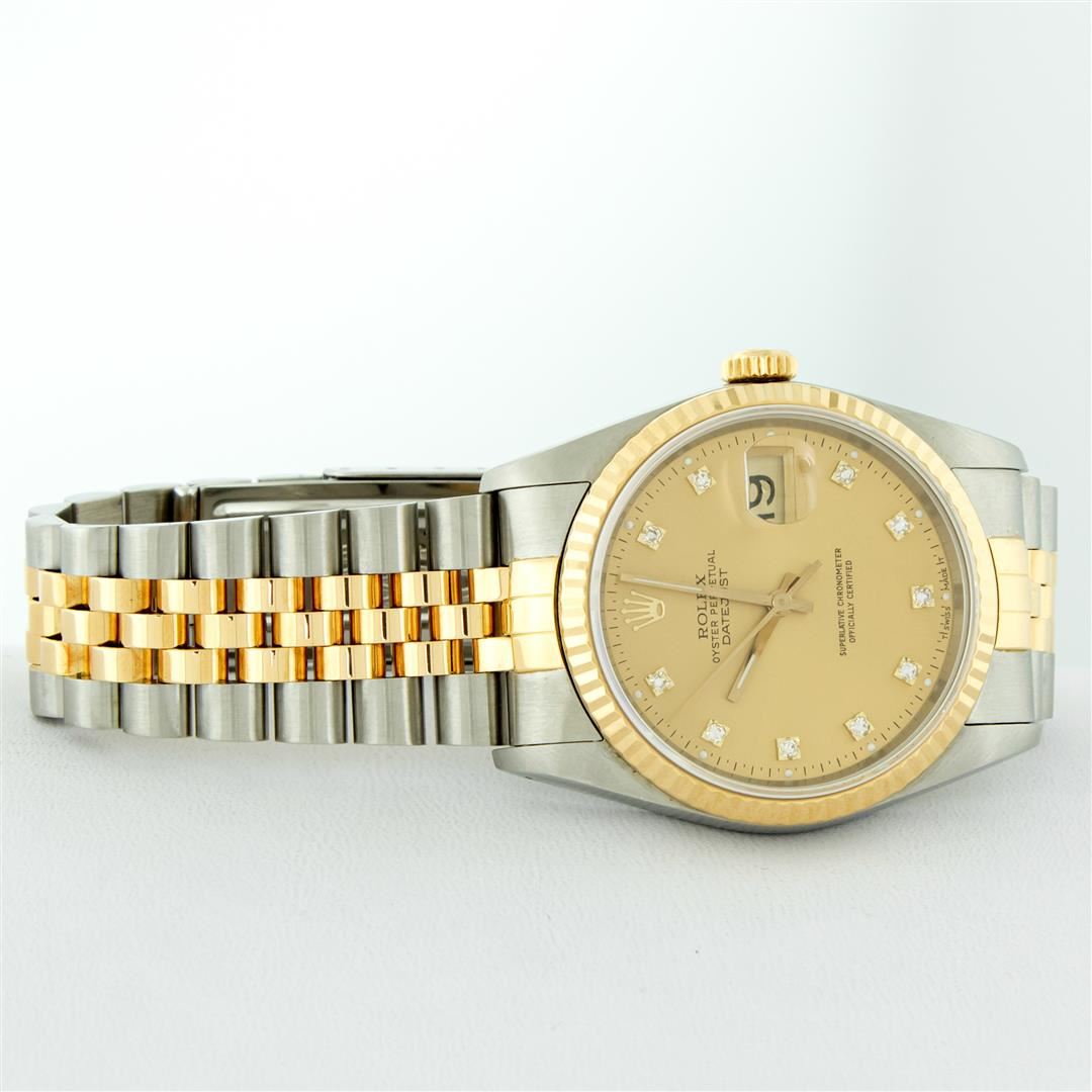 One Mens Yellow Gold Two Tone Rolex Datejust Polished, Serviced & Electronically Tested, Yellow Gold & Stainless Steel Case: 36mm, Yellow Gold Crown, Bezel: Original Rolex Yellow Gold Fluted Bezel, Custom Crystal: New Acrylic Crystal Lens. Hands: Luminesc