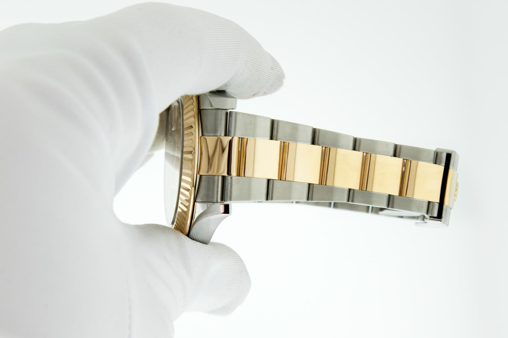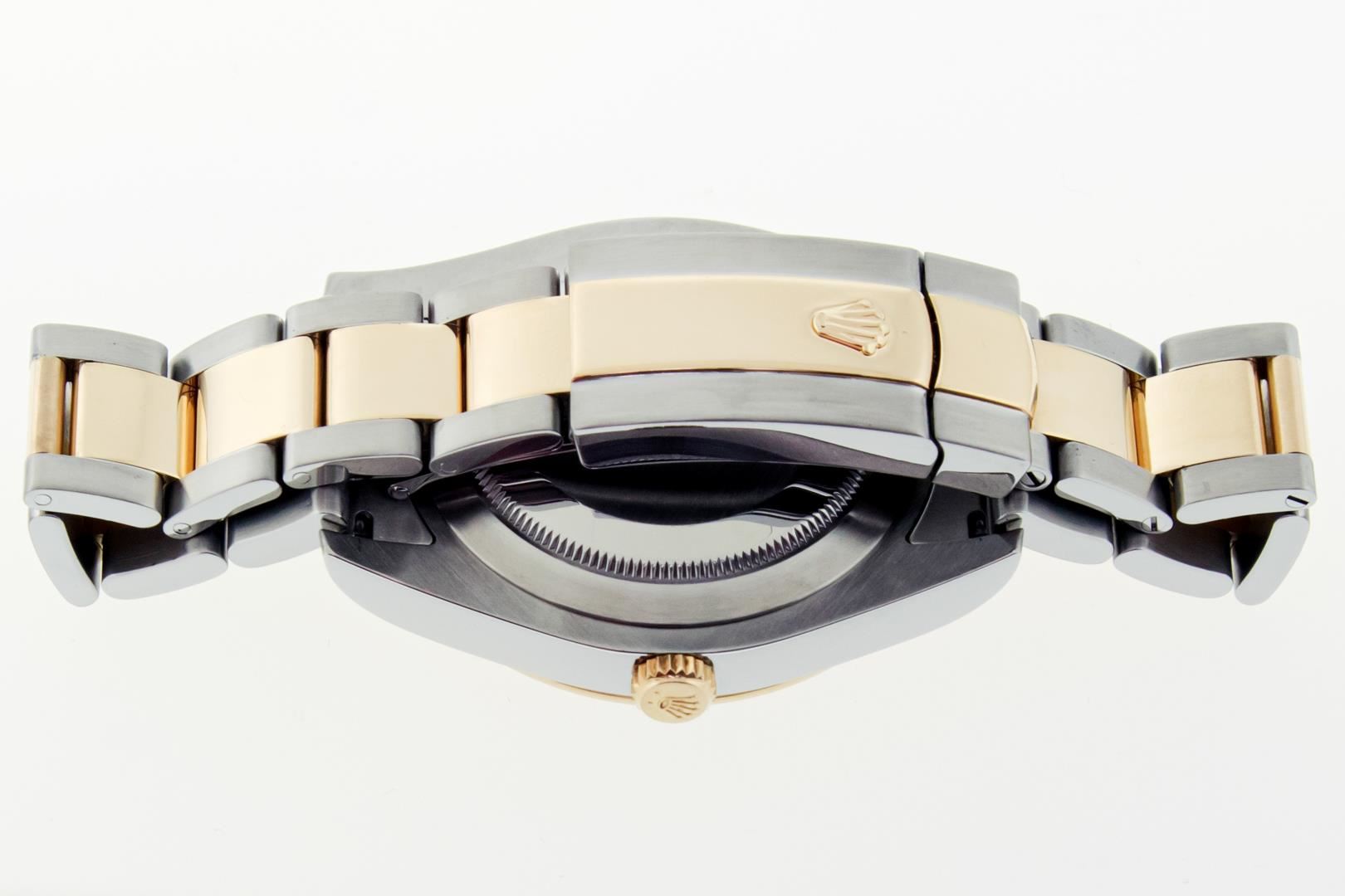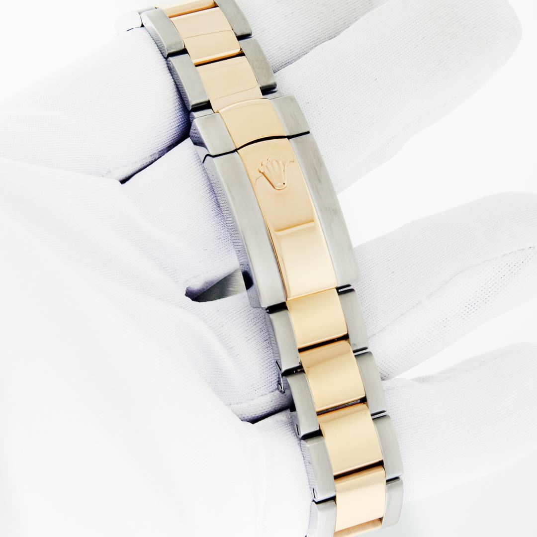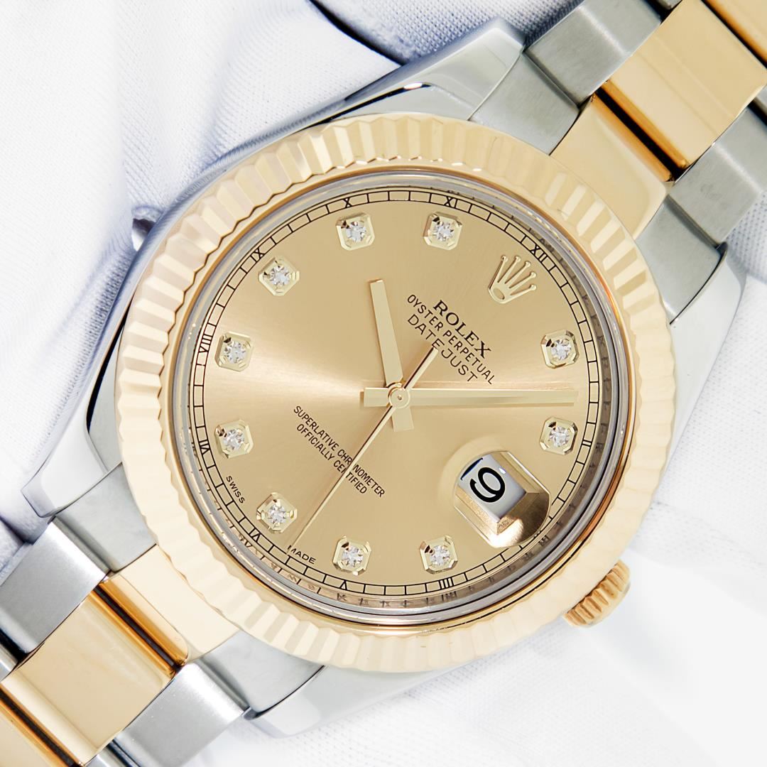 One Mens Pre Owned 18K Yellow Gold & Stainless Steel Rolex Datejust 2 41MM Polished, Serviced & Electronically Tested, Rolex Yellow Gold & Stainless Steel Case: 41mm, Rolex Yellow Gold Crown, Rolex Bezel: 18K Yellow Gold Fluted Bezel. Crystal: Sapphire With Magnified Date Window. Rolex Hands: Rolex Hands. Rolex Movement: Automatic Winding Movement 3136. Rolex Dial: Factory Champagne Diamond Dial With Square Roman Track, Diamond Count: 10 Diamonds in Dial, VS Clarity. Date Window: 3 O'Clock Position Date Display, Quickset, Model: Datejust 41. Condition: G-6 Extra Fine. Rolex Bracelet: Two Tone 18K Yellow Gold & Stainless Steel Oyster Band. Bright Polish. 7.0 Inch Length, Adjustable. Standard Clasp, With Rolex Logo. This Watch Has Been Serviced And Polished It Is Free Of All Scratches And Dents.