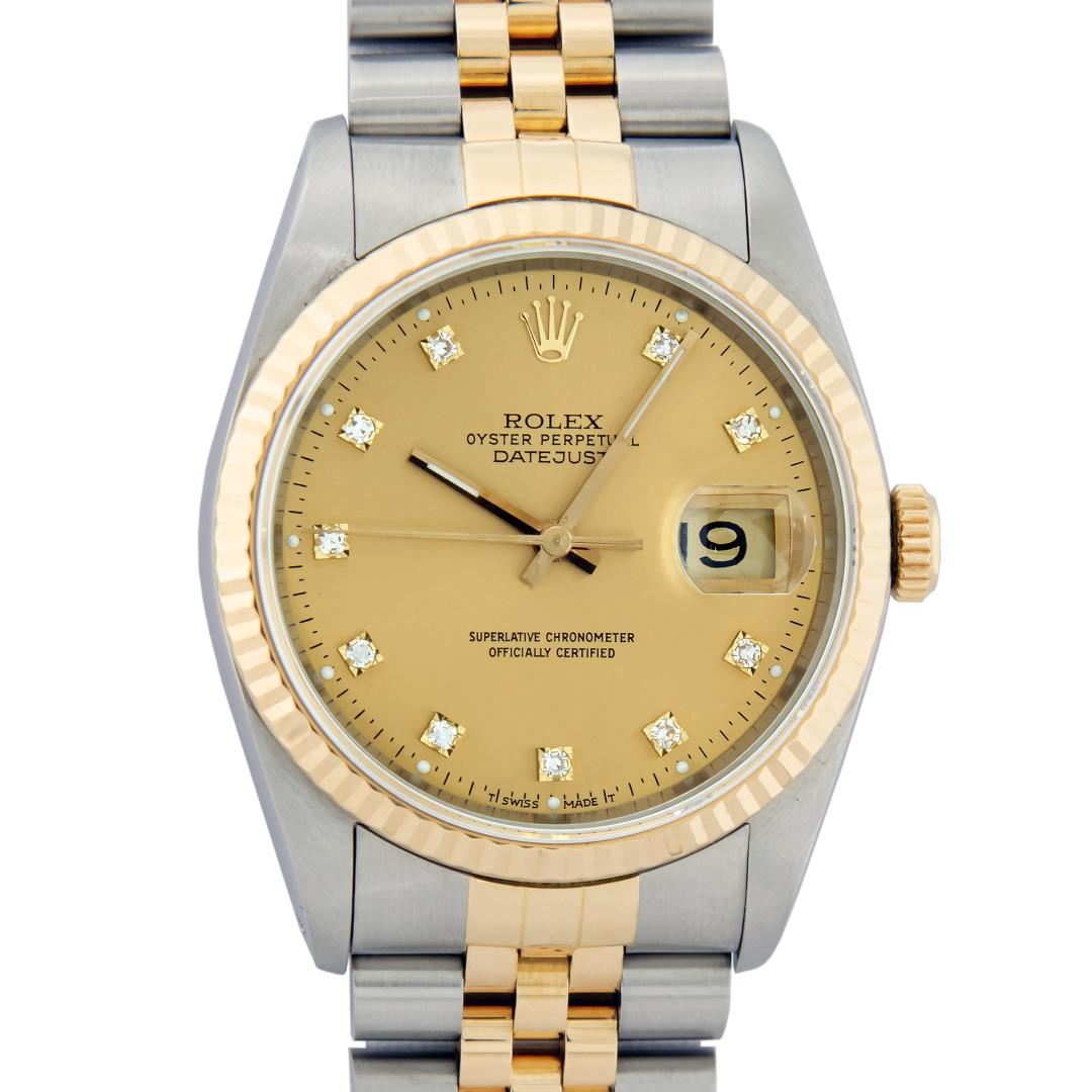 One Mens Quickset Pre Owned Two Tone Yellow Gold And Stainless Steel Rolex Datejust Polished, Serviced & Electronically Tested, Yellow Gold & Stainless Steel Case: 36mm, Yellow Gold Crown, Rolex Bezel: Rolex 14K Yellow Gold Fluted Bezel, Custom Crystal: New Acrylic Crystal Lens With Magnified Date Window. Hands: Luminescent Hands. Rolex Movement: Automatic Winding Movement 3035. Rolex Dial: Rolex Factory Champagne Diamond Dial With Dash Track & Lumi Dots, Diamond Count: 10 Diamonds In Dial, Clarity: VVS,Date Window: 3 O'Clock Position Date Display, Quickset, Model: Quickset Datejust. Condition: G-6 Extra Fine. Rolex Bracelet: Two Tone 14K Yellow Gold & Stainless Steel Jubilee Band. Bright Polish. 7.0 Inch Length, Adjustable. Standard Clasp, With Rolex Logo. This Watch Has Been Serviced Time Tested And Is In Excellent Condition It Is Free Of All Scratches And Dents.