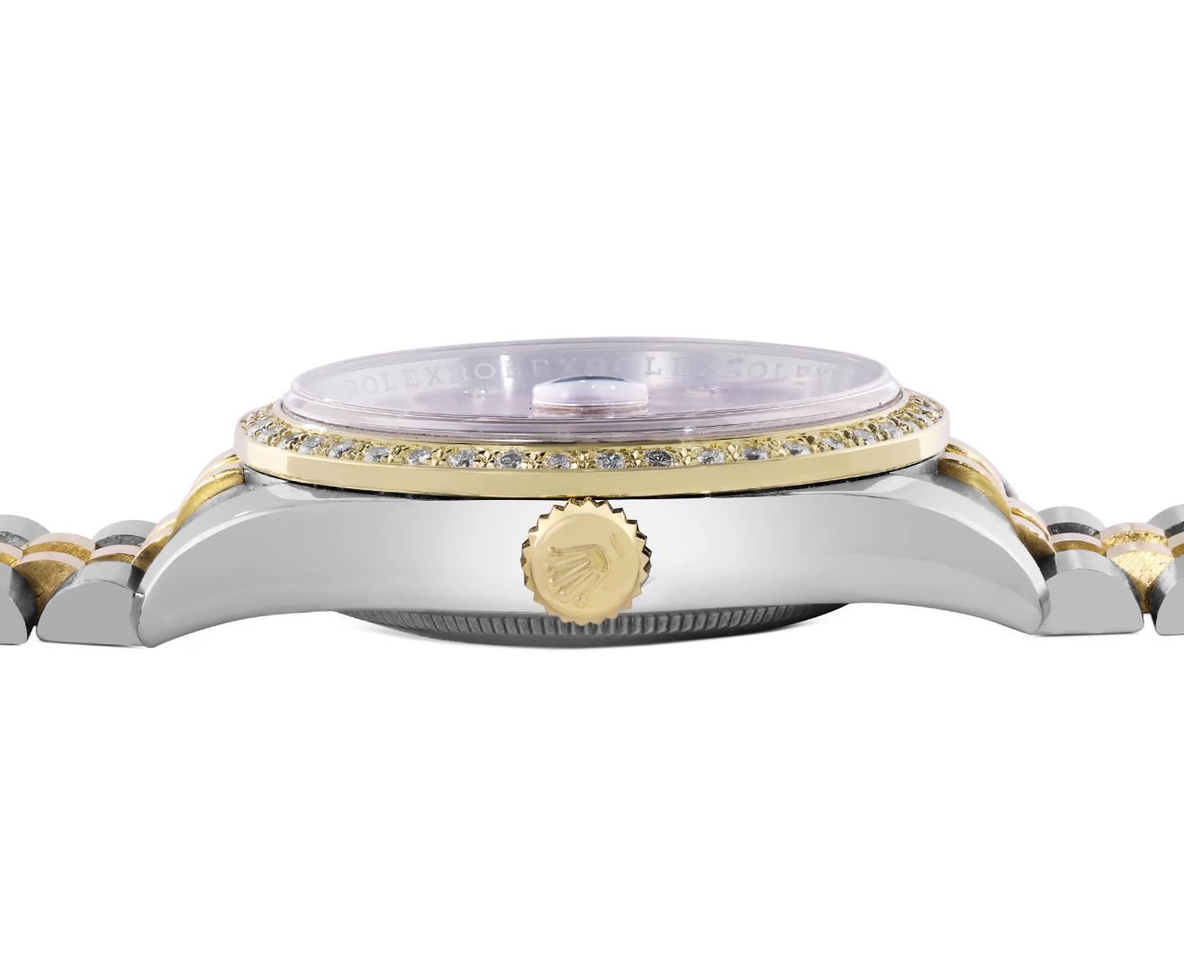 One Mens Pre Owned 18K Yellow Gold & Stainless Steel Rolex Datejust 36MM Polished, Serviced & Electronically Tested, Rolex Yellow Gold & Stainless Steel Case: 36mm, Rolex Yellow Gold Crown, Custom Bezel: New 18K Yellow Gold Beadset Diamond Bezel, Diamond Count: 44 Diamonds, Clarity: SI-VS, Color: G to H. Crystal: Sapphire With Magnified Date Window. Hands: Solid Hands. Rolex Movement: Automatic Winding Movement 3135. Rolex Dial: Factory Champagne Jubilee Diamond Dial Diamond Count: 10 Diamonds On Dial, Clarity: VVS. Date Window: 3 O'Clock Position Date Display, Quickset, Model: 116233 Datejust. Condition: G-6 Extra Fine. Rolex Bracelet: Two Tone 18K Yellow Gold & Stainless Steel Jubilee Band. Bright Polish. 7.0 Inch Length, Adjustable. Hidden Clasp, With Rolex Logo. This Watch Has Been Serviced And Polished It Is Free Of All Scratches And Dents.