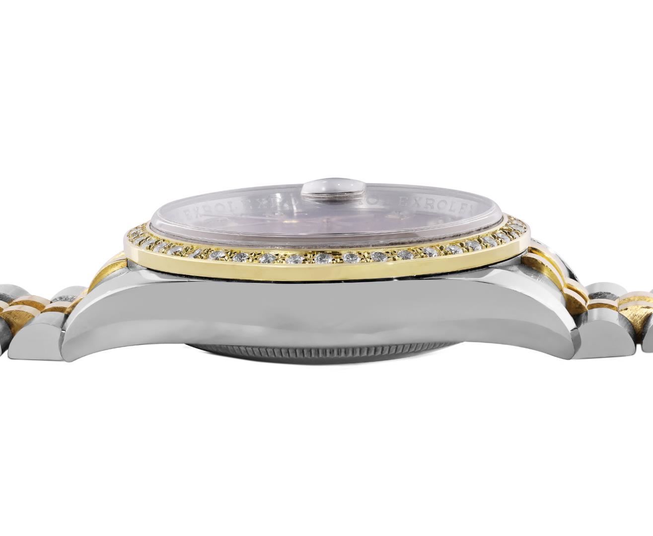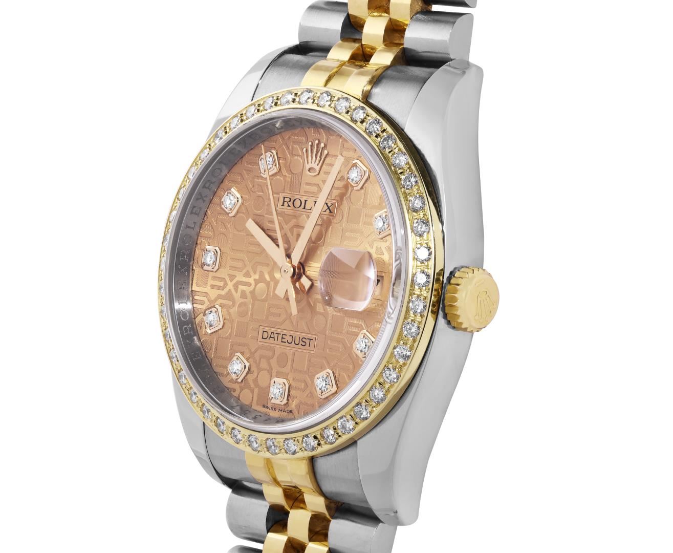 One Mens Pre Owned 18K Yellow Gold & Stainless Steel Rolex Datejust 36MM Polished, Serviced & Electronically Tested, Rolex Yellow Gold & Stainless Steel Case: 36mm, Rolex Yellow Gold Crown, Custom Bezel: New 18K Yellow Gold Beadset Diamond Bezel, Diamond Count: 44 Diamonds, Clarity: SI-VS, Color: G to H. Crystal: Sapphire With Magnified Date Window. Hands: Solid Hands. Rolex Movement: Automatic Winding Movement 3135. Rolex Dial: Factory Champagne Jubilee Diamond Dial Diamond Count: 10 Diamonds On Dial, Clarity: VVS. Date Window: 3 O'Clock Position Date Display, Quickset, Model: 116233 Datejust. Condition: G-6 Extra Fine. Rolex Bracelet: Two Tone 18K Yellow Gold & Stainless Steel Jubilee Band. Bright Polish. 7.0 Inch Length, Adjustable. Hidden Clasp, With Rolex Logo. This Watch Has Been Serviced And Polished It Is Free Of All Scratches And Dents.
