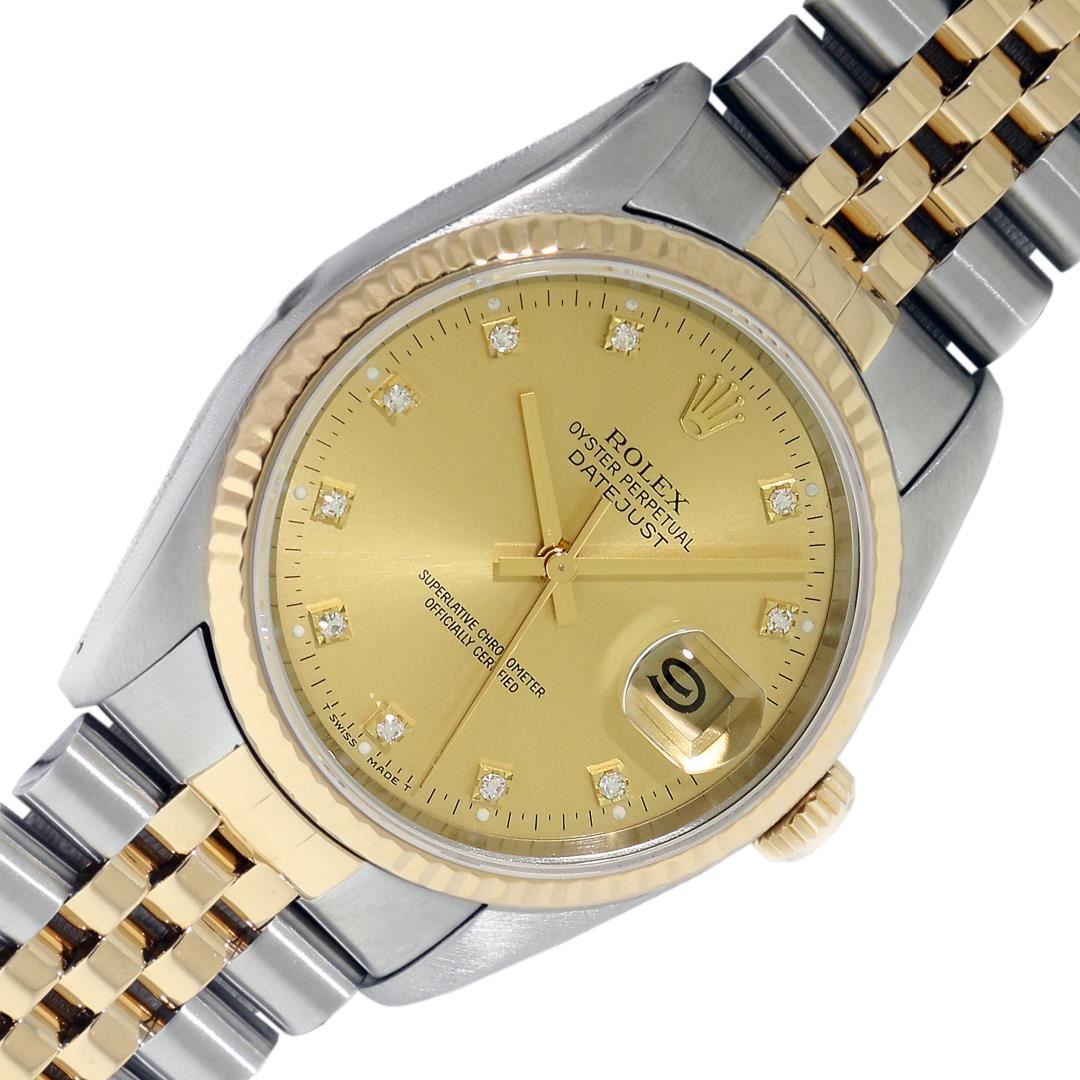 One Mens Pre Owned 18K Yellow Gold And Stainless Steel Rolex Datejust Polished, Serviced & Electronically Tested, Rolex Yellow Gold & Stainless Steel Case: 36mm, Rolex Yellow Gold Crown, Rolex Bezel: 18K Yellow Gold Fluted Bezel. Crystal: Sapphire With Magnified Date Window. Hands: Solid Hands. Rolex Movement: Automatic Winding Movement 3135. Rolex Dial: Champagne With VVS Factory Diamond Hour Markers & Dash Track, Diamond Count: 10 Diamonds in Dial, VVS Clarity. Date Window: 3 O'Clock Position Date Display, Quickset, Model: Sapphire Datejust. Condition: G-6 Extra Fine. Rolex Bracelet: Two Tone 18K Yellow Gold & Stainless Steel Jubilee Band. Bright Polish. 7.0 Inch Length, Adjustable. Standard Clasp, With Rolex Logo. This Watch Has Been Serviced And Polished It Is Free Of All Scratches And Dents.