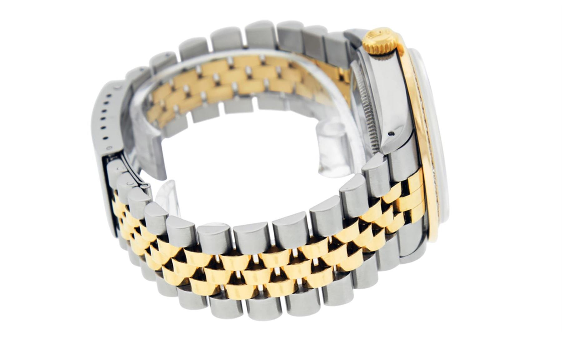 One Mens Rolex Datejust Polished Bright with Satin Finish, Serviced & Electronically Tested, 14K Yellow Gold And Stainless Steel Case:36mm, Yellow Gold Crown, Custom Bezel: 14K Yellow Gold Princess Cut Diamond Bezel, Diamond Count: 53 Diamonds, Total Weight 2.75 Carat, Clarity: SI-VS, Color: G to H. Custom Crystal: Synthetic Sapphire Cyclops Lens. Movement: Automatic Winding Movement Caliber 3035. Custom Dial: Green String Diamond Dial, Diamond Count: 58 Diamond in Dial, Dial Color: G To H In Color, Clarity: VS2-SI1. Date Window: 3 O'Clock Position Date Display, Quickset, Model: 16013 Condition: G-6 Extra Fine. Bracelet: 14K Yellow Gold And Stainless Steel Jubilee. Bright Polish & Satin Finish. 7.0 Inch Length, Adjustable. Standard Clasp, With Rolex Logo. This Watch Has Been Serviced and Polished And It Is Free Of All Dents And Scratches And Has Been Time Tested.