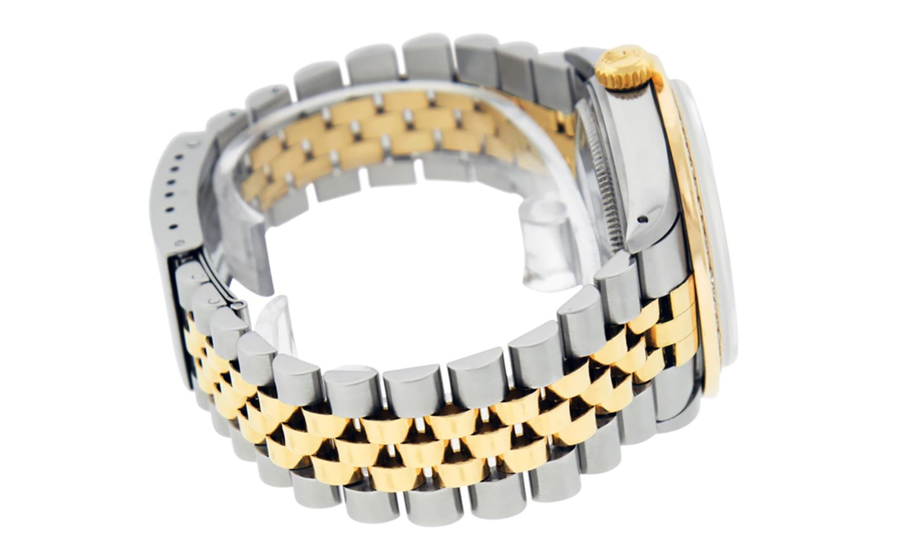 One Mens Pre Owned Two Tone Yellow Gold And Stainless Steel Rolex Datejust Polished Bright with Satin Finish, Serviced And Electronically Tested, Rolex Yellow Gold And Stainless Steel Case: 36mm, Rolex Yellow Gold Crown, Custom Bezel: New 14K Yellow Gold Princess Cut Diamond Bezel, Diamond Count: 53 Diamonds, Total Weight 2.75 Carat. Custom Crystal: New Sapphire With Magnified Date. Custom Hands: New Luminescent Hands. Rolex Movement: Automatic Winding Movement 3035. Custom Dial: Custom Green Dial With Added Diamonds, Diamond Count: 58 Diamond On Dial. Date Window: 3 O'Clock Position Date Display, Quickset, Model: Datejust. Condition: G-6 Extra Fine. Rolex Bracelet: Yellow Gold And Stainless Steel Jubilee Band. Bright Polish And Satin Finish. 7.0 Inch Length, Adjustable. Standard Clasp, With Rolex Logo. This Watch Has Been Serviced and Polished And It Is Free Of All Dents And Scratches And Has Been Time Tested.