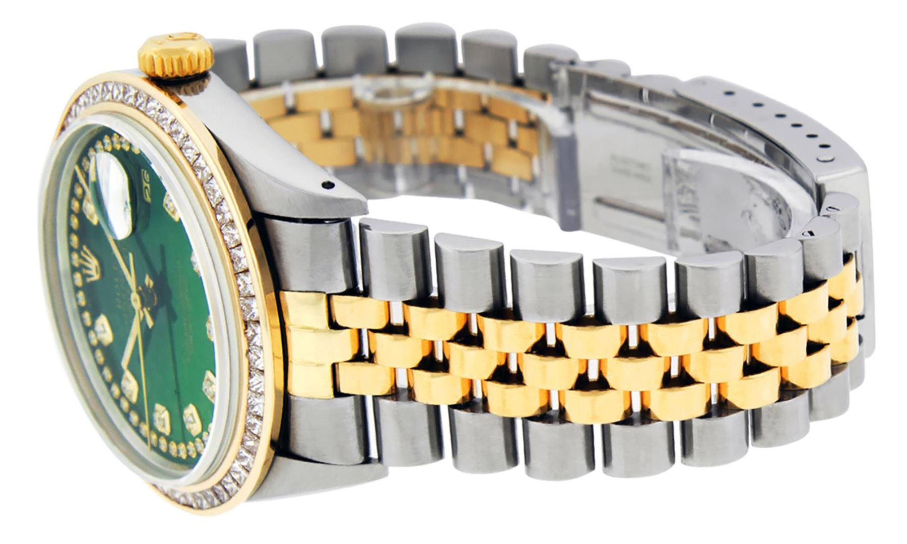 One Mens Pre Owned Two Tone Yellow Gold And Stainless Steel Rolex Datejust Polished Bright with Satin Finish, Serviced And Electronically Tested, Rolex Yellow Gold And Stainless Steel Case: 36mm, Rolex Yellow Gold Crown, Custom Bezel: New 14K Yellow Gold Princess Cut Diamond Bezel, Diamond Count: 53 Diamonds, Total Weight 2.75 Carat. Custom Crystal: New Sapphire With Magnified Date. Custom Hands: New Luminescent Hands. Rolex Movement: Automatic Winding Movement 3035. Custom Dial: Custom Green Dial With Added Diamonds, Diamond Count: 58 Diamond On Dial. Date Window: 3 O'Clock Position Date Display, Quickset, Model: Datejust. Condition: G-6 Extra Fine. Rolex Bracelet: Yellow Gold And Stainless Steel Jubilee Band. Bright Polish And Satin Finish. 7.0 Inch Length, Adjustable. Standard Clasp, With Rolex Logo. This Watch Has Been Serviced and Polished And It Is Free Of All Dents And Scratches And Has Been Time Tested.