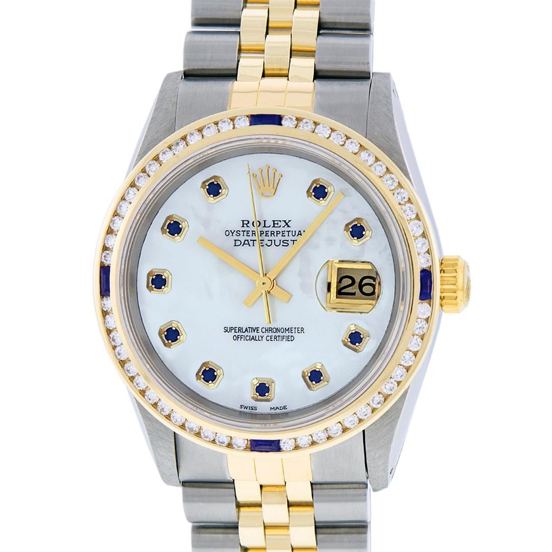 One Mens Two Tone Rolex Datejust Polished, Serviced & Electronically Tested, 14K Yellow Gold & Stainless Steel Case:36mm, 14K Yellow Gold Crown, Custom Bezel: 18K Yellow Gold Sapphire Channel Set Diamond Bezel, Diamond Count: 52 Diamonds + 4 Sapphires, Total Weight 1.30 Carat, Clarity: SI-VS, Color: G to H. Custom Crystal: Synthetic Sapphire Cyclops Lens. Movement: Automatic Winding Movement Caliber 3035. Custom Dial: Mother Of Pearl Dial With Sapphire Hour Markers, Stone Count: 10 Sapphires in Dial. Date Window: 3 O'Clock Position Date Display, Quickset, Model: 16013 Condition: G-6 Extra Fine. Bracelet: Two Tone 14K Yellow Gold & Stainless Steel Jubilee. Bright Polish. 7.0 Inch Length, Adjustable. Standard Clasp, With Rolex Logo.