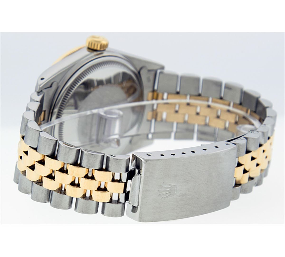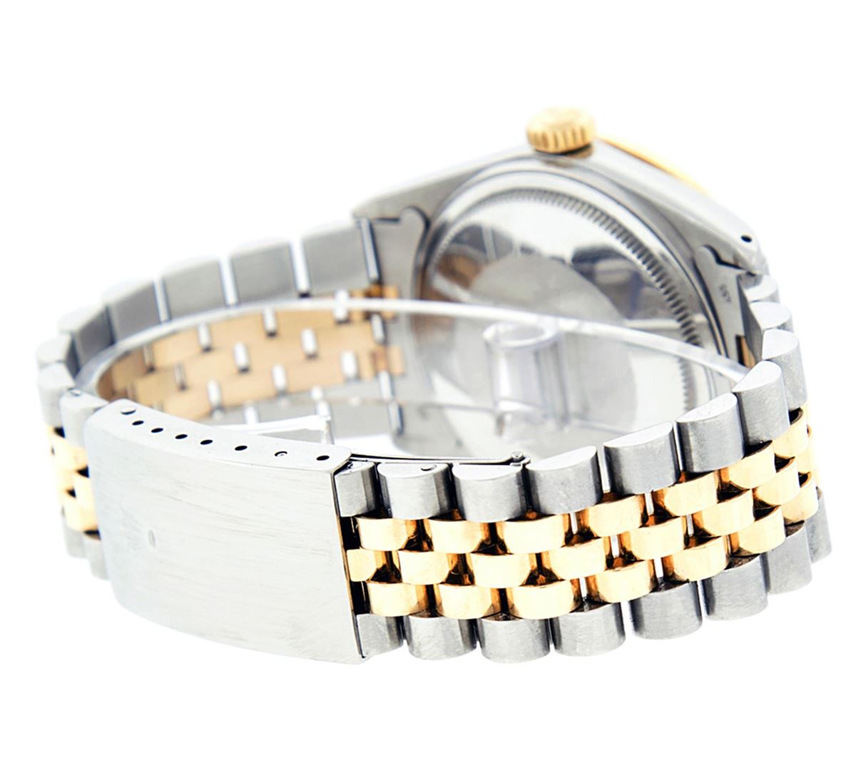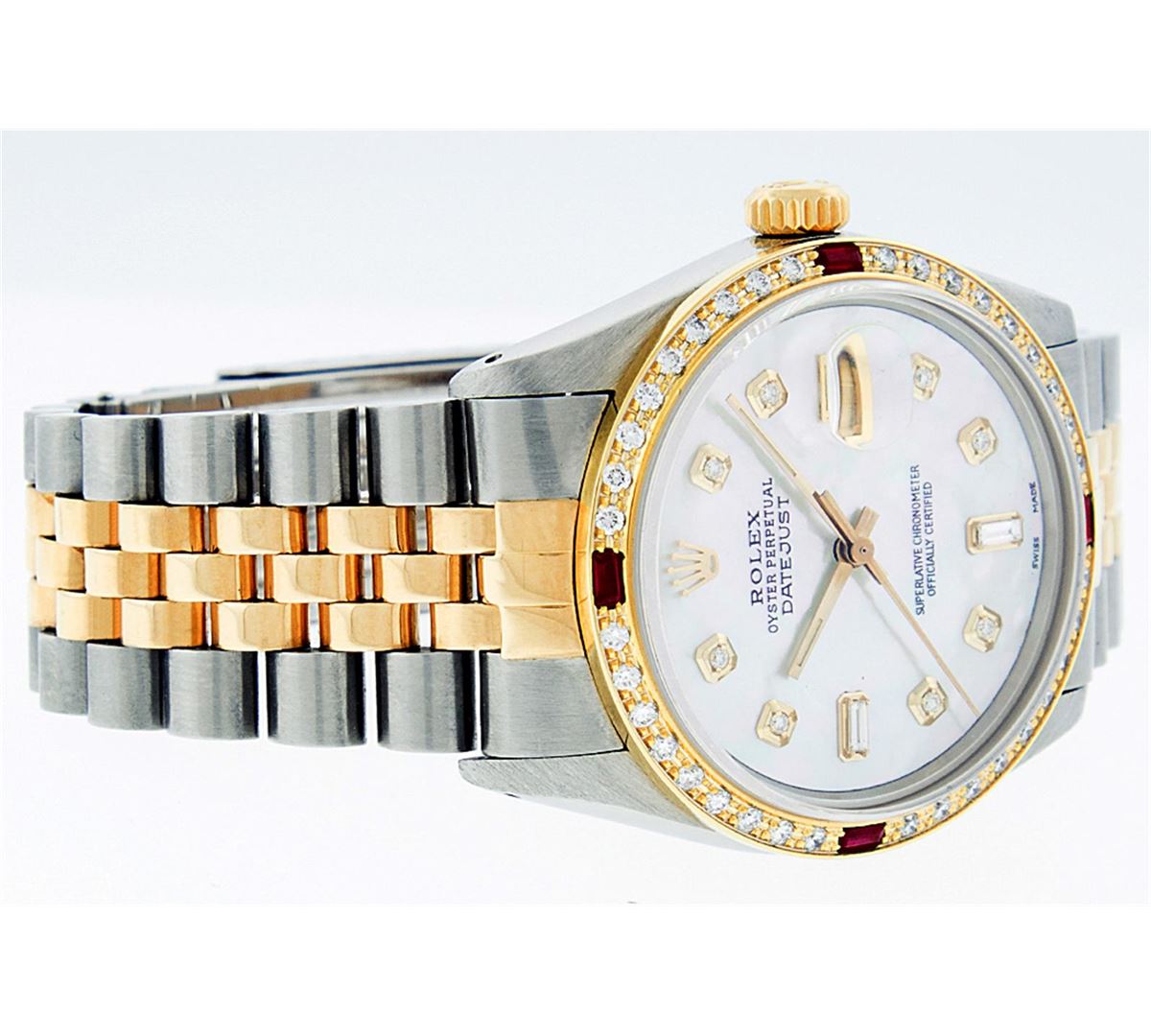 One Mens Two Tone Rolex Datejust Polished, Serviced & Electronically Tested, 14K Yellow Gold & Stainless Steel Case:36mm, 14K Yellow Gold Crown, Custom Bezel: 18K Yellow Gold Ruby Beadset Diamond Bezel, Diamond + Gem Count: 38 Diamonds + 4 Rubies Total Weight 1.00 Carat, Clarity: Si-VS, Color: G to H. Custom Crystal: Synthetic Sapphire Cyclops Lens. Movement: Automatic Winding Movement Caliber 3035. Custom Dial: Mother Of Pearl Diamond With Baguette, 8 Diamonds + 2 Baguettes in Dial, Dial Weight: .40 Carat G To H In Color, Clarity: SI-VS Date Window: 3 O'Clock Position Date Display, Quickset, Model: 16013 Condition: G-6 Extra Fine. Bracelet:Two Tone 14K Yellow Gold & Stainless Steel Jubilee. Bright Polish. 7.0 Inch Length, Adjustable. Standard Clasp, With Rolex Logo.
