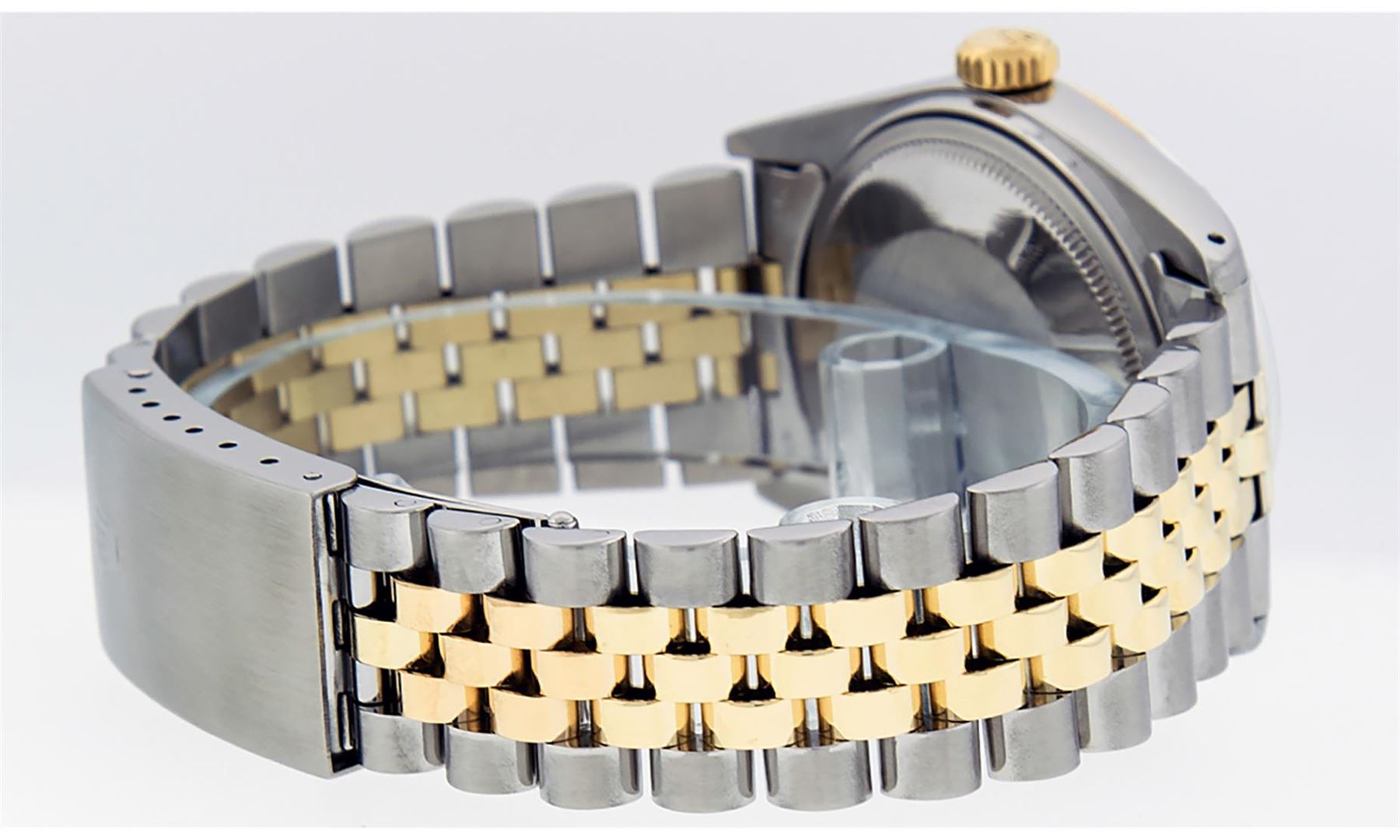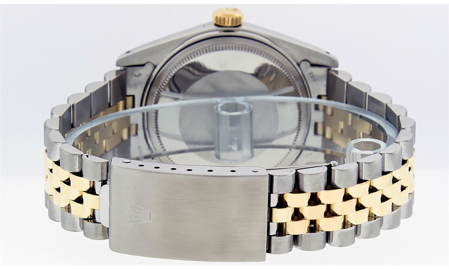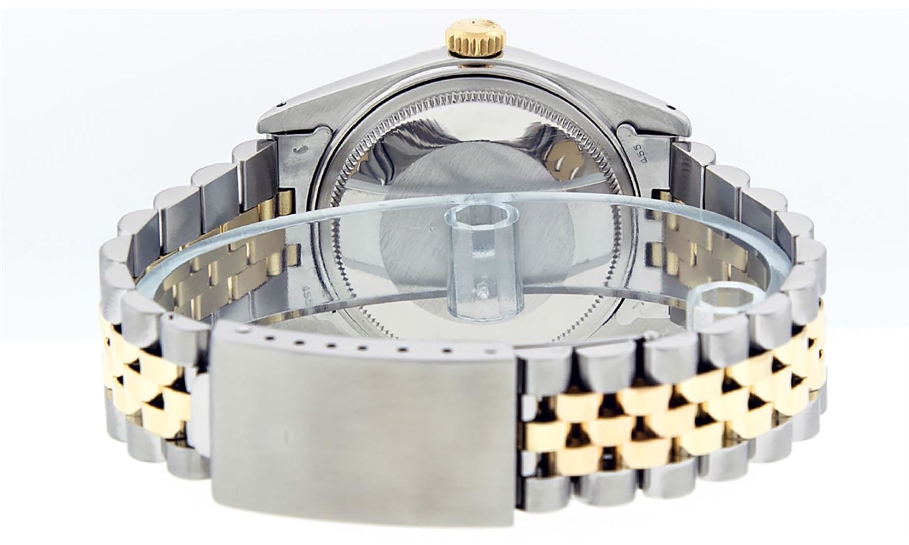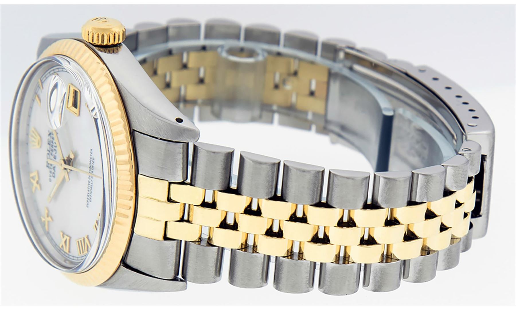 One Mens Pre Owned Yellow Gold Two Tone Rolex Datejust Polished, Serviced & Electronically Tested, Rolex Yellow Gold & Stainless Steel Case: 36mm, Rolex Yellow Gold Crown, Rolex Bezel: Yellow Gold Fluted Bezel. Custom Crystal: New Acrylic Cyclops Lens. Cu