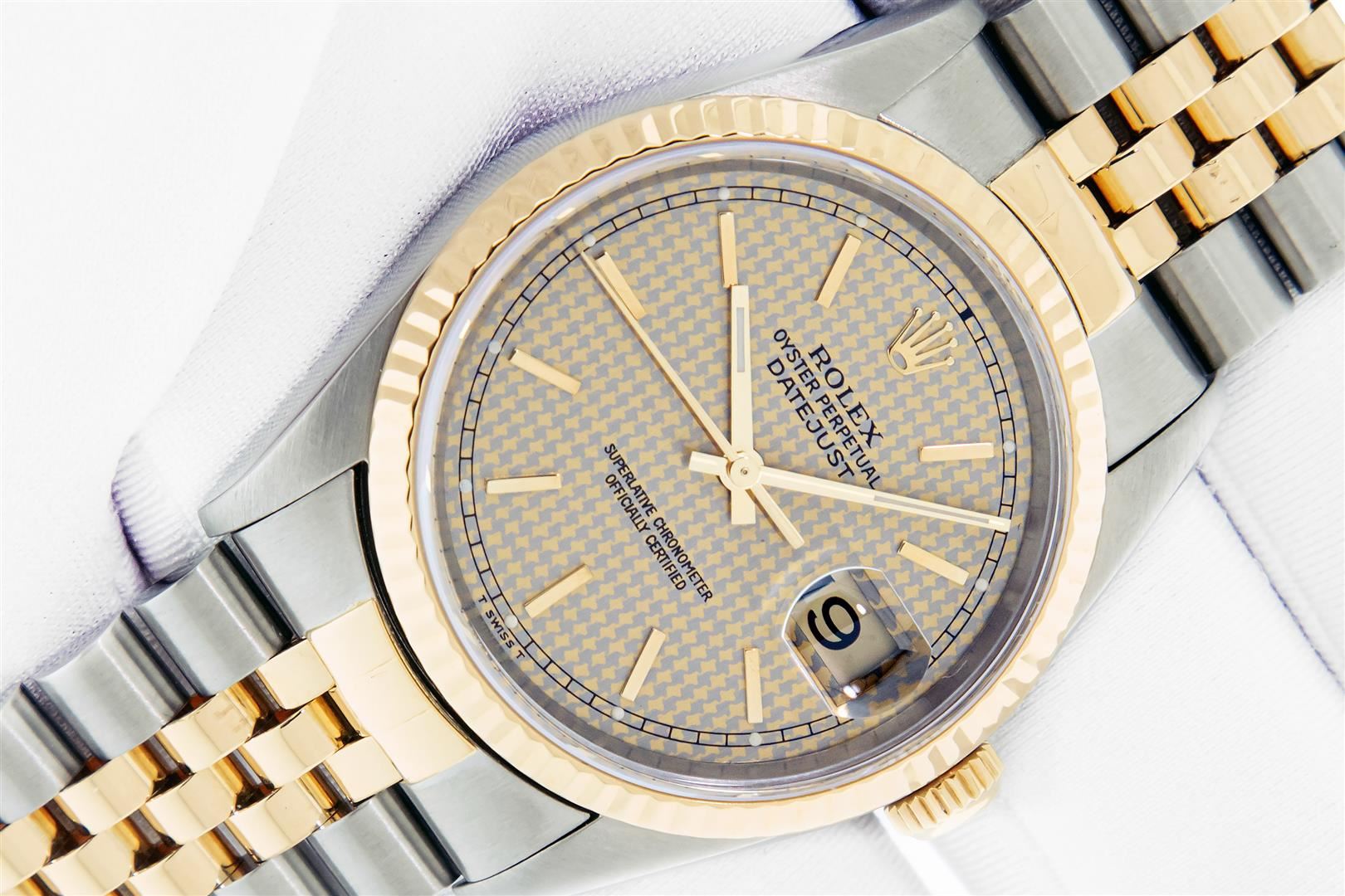 One Mens Pre Owned 18K Yellow Gold & Stainless Steel Two Tone Rolex Oyster Perpetual Datejust Polished, Serviced & Electronically Tested, Rolex 18K Yellow Gold & Stainless Steel Case: 36mm, Rolex Original 18K Yellow Gold Crown, Rolex Bezel: Original Rolex
