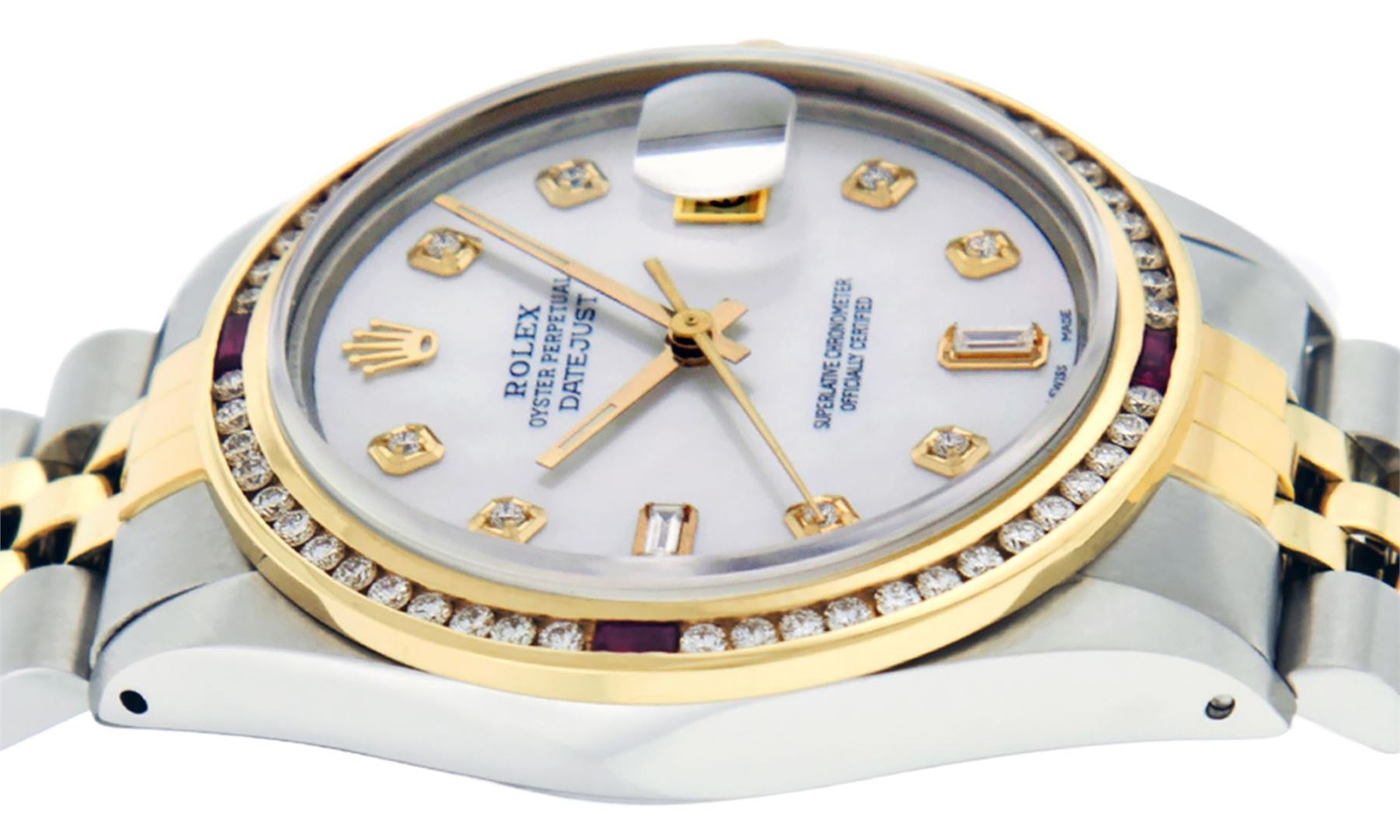 One Mens Pre Owned Two Tone Yellow Gold And Stainless Steel Rolex Datejust Polished, Serviced And Electronically Tested, Rolex Yellow Gold And Stainless Steel Case: 36mm, Rolex Yellow Gold Crown, Custom Bezel: New 18K Yellow Gold Ruby Channel Set Diamond Bezel, Diamond Count: 52 Diamonds + 4 Rubies, Total Weight 1.30 Carat. Custom Crystal: New Sapphire With Magnified Date Window. Custom Hands: New Luminescent Hands. Rolex Movement: Automatic Winding Movement 3035. Custom Dial: Custom White Diamond Dial, Stone Count: 8 Diamonds + 2 Baguette Diamonds On Dial. Date Window: 3 O'Clock Position Date Display, Quickset, Model: Condition: G-6 Extra Fine. Rolex Bracelet: Two Tone Yellow Gold And Stainless Steel Jubilee Band. Bright Polish. 7.0 Inch Length, Adjustable. Standard Clasp, With Rolex Logo. This Watch Has Been Serviced Time Tested And Is In Excellent Condition It Is Free Of All Scratches And Dents.